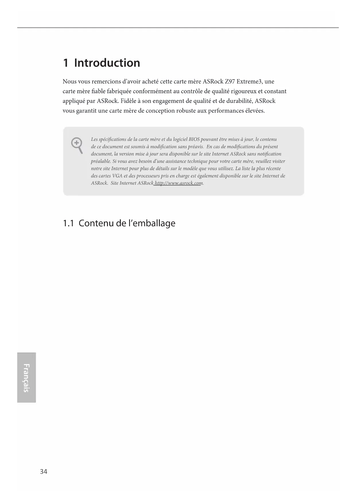 RRI#1 Diese COM1-Stileiste unterstützt ein Modul für serielle Ports.34 Français 1 Introduction Nous vous remercions d’avoir acheté cette carte mère ASRock Z97 Extreme3, une carte mère able fabriquée conformément au contrôle de qualité rigoureux et constant appliqué par ASRock. Fidèle à son engagement de qualité et de durabilité, ASRock vous garantit une carte mère de conception robuste aux performances élevées.