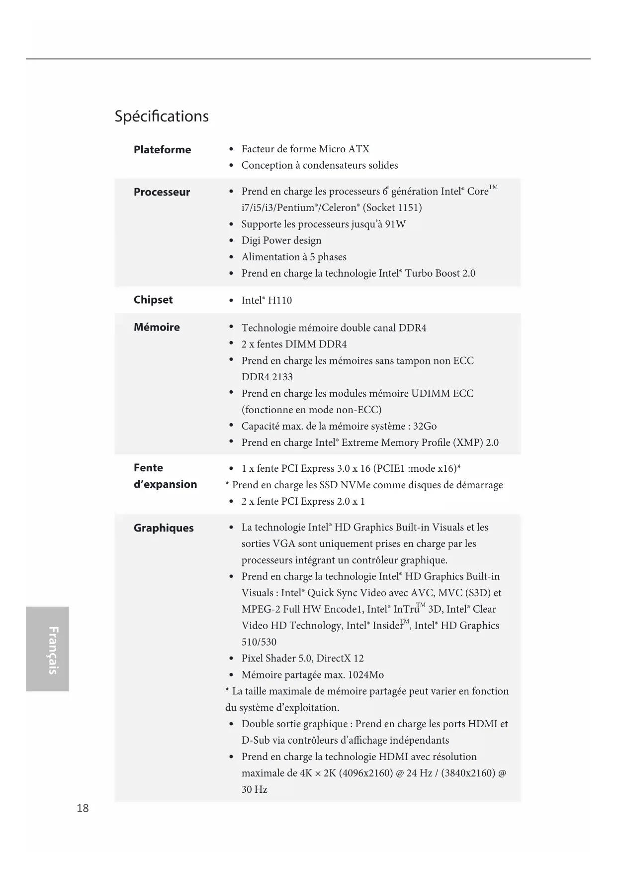 | Caractéristiques techniques | Format Micro ATX, Socket LGA 1151, Chipset Intel H110 |