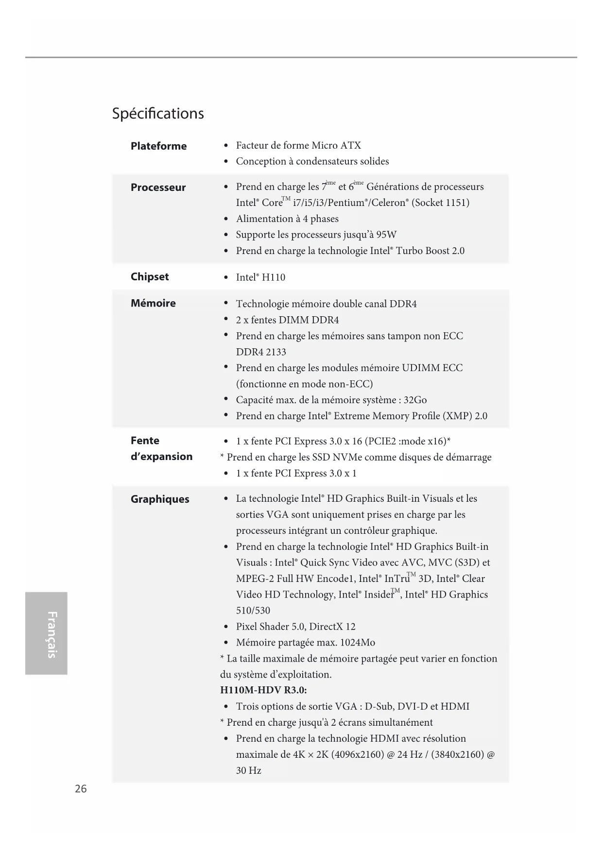 - La taille maximale de mémoire partagée peut varier en fonction du système d’exploitation. H110M-HDV R3.0:
