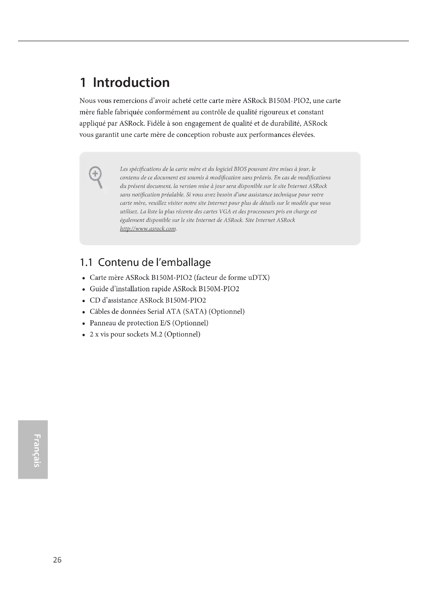 GND TTXD1DDCD#1 RRI#126 Français 1 Introduction Nous vous remercions d’avoir acheté cette carte mère ASRock B150M-PIO2, une carte mère able fabriquée conformément au contrôle de qualité rigoureux et constant appliqué par ASRock. Fidèle à son engagement de qualité et de durabilité, ASRock vous garantit une carte mère de conception robuste aux performances élevées.