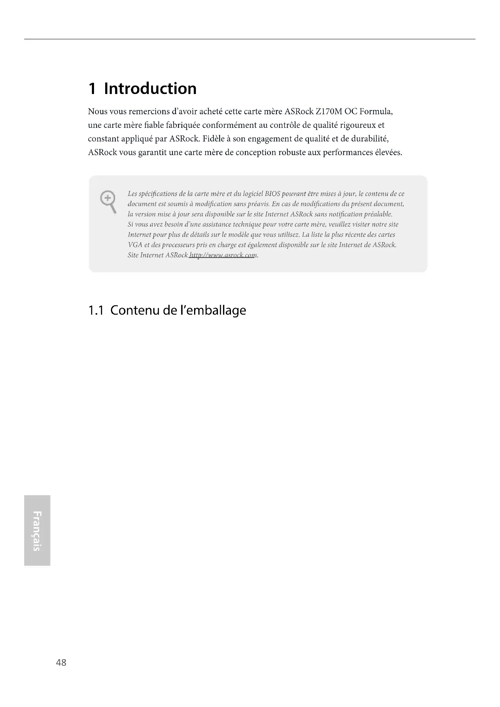OFF48 Français 1 Introduction Nous vous remercions d’avoir acheté cette carte mère ASRock Z170M OC Formula, une carte mère able fabriquée conformément au contrôle de qualité rigoureux et constant appliqué par ASRock. Fidèle à son engagement de qualité et de durabilité, ASRock vous garantit une carte mère de conception robuste aux performances élevées.