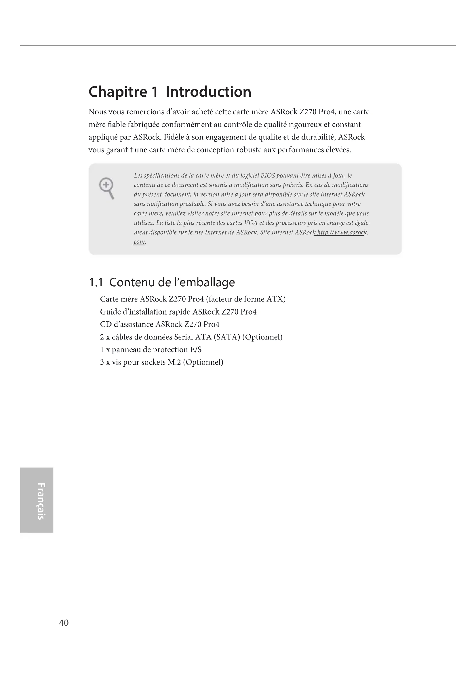 Nous vous remercions d’avoir acheté cette carte mère ASRock Z270 Pro4, une carte mère able fabriquée conformément au contrôle de qualité rigoureux et constant appliqué par ASRock. Fidèle à son engagement de qualité et de durabilité, ASRock vous garantit une carte mère de conception robuste aux performances élevées.