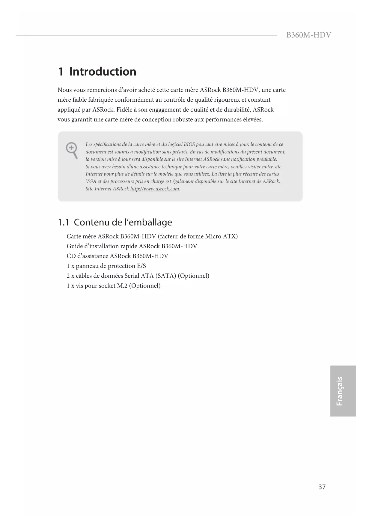 SLCT37 B360M-HDV Français 1 Introduction Nous vous remercions d’avoir acheté cette carte mère ASRock B360M-HDV, une carte mère able fabriquée conformément au contrôle de qualité rigoureux et constant appliqué par ASRock. Fidèle à son engagement de qualité et de durabilité, ASRock vous garantit une carte mère de conception robuste aux performances élevées.