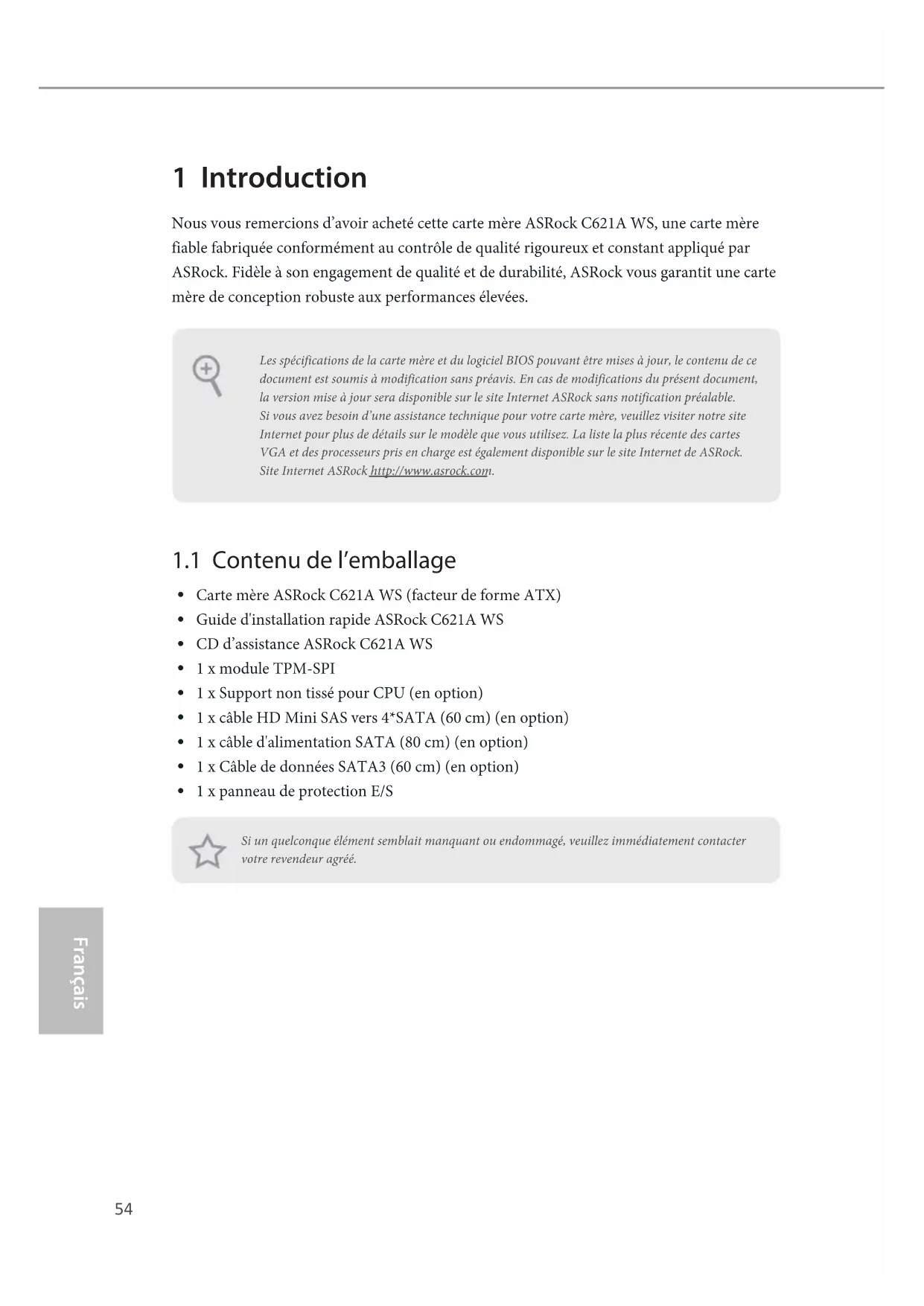 1 x panneau de protection E/S Si un quelconque élément semblait manquant ou endommagé, veuillez immédiatement contacter votre revendeur agréé.Les spécifications de la carte mère et du logiciel BIOS pouvant être mises à jour, le contenu de ce document est soumis à modification sans préavis. En cas de modifications du présent document, la version mise à jour sera disponible sur le site Internet ASRock sans notification préalable. Si vous avez besoin d’une assistance technique pour votre carte mère, veuillez visiter notre site Internet pour plus de détails sur le modèle que vous utilisez. La liste la plus récente des cartes VGA et des processeurs pris en charge est également disponible sur le site Internet de ASRock. Site Internet ASRock http://www.asrock.com.55 C621A WS Français Français