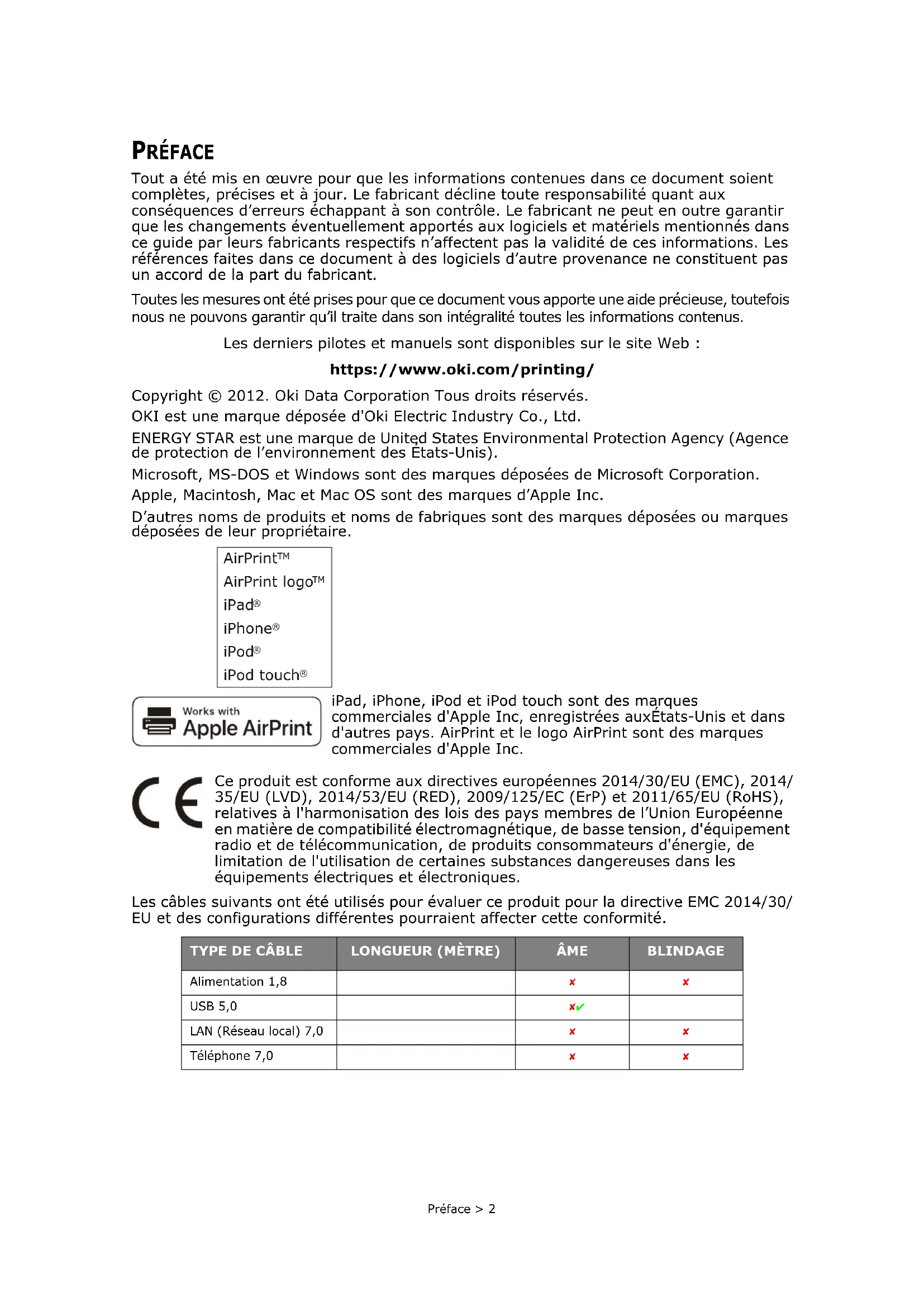 RÉFACE Tout a été mis en œuvre pour que les informations contenues dans ce document soient complètes, précises et à jour. Le fabricant décline toute responsabilité quant aux conséquences d’erreurs échappant à son contrôle. Le fabricant ne peut en outre garantir que les changements éventuellement apportés aux logiciels et matériels mentionnés dans ce guide par leurs fabricants respectifs n’affectent pas la validité de ces informations. Les références faites dans ce document à des logiciels d’autre provenance ne constituent pas un accord de la part du fabricant. Toutes les mesures ont été prises pour que ce document vous apporte une aide précieuse, toutefois nous ne pouvons garantir qu’il traite dans son intégralité toutes les informations contenus. Les derniers pilotes et manuels sont disponibles sur le site Web : https://www.oki.com/printing/ Copyright © 2012. Oki Data Corporation Tous droits réservés. OKI est une marque déposée d'Oki Electric Industry Co., Ltd. ENERGY STAR est une marque de United States Environmental Protection Agency (Agence de protection de l’environnement des États-Unis). Microsoft, MS-DOS et Windows sont des marques déposées de Microsoft Corporation. Apple, Macintosh, Mac et Mac OS sont des marques d’Apple Inc. D’autres noms de produits et noms de fabriques sont des marques déposées ou marques déposées de leur propriétaire. iPad, iPhone, iPod et iPod touch sont des marques commerciales d'Apple Inc, enregistrées auxÉtats-Unis et dans d'autres pays. AirPrint et le logo AirPrint sont des marques commerciales d'Apple Inc. Ce produit est conforme aux directives européennes 2014/30/EU (EMC), 2014/ 35/EU (LVD), 2014/53/EU (RED), 2009/125/EC (ErP) et 2011/65/EU (RoHS), relatives à l'harmonisation des lois des pays membres de l’Union Européenne en matière de compatibilité électromagnétique, de basse tension, d'équipement radio et de télécommunication, de produits consommateurs d'énergie, de limitation de l'utilisation de certaines substances dangereuses dans les équipements électriques et électroniques. Les câbles suivants ont été utilisés pour évaluer ce produit pour la directive EMC 2014/30/ EU et des configurations différentes pourraient affecter cette conformité. TYPE DE CÂBLE LONGUEUR (MÈTRE) ÂME BLINDAGE Alimentation 1,8 USB 5,0✘ ✔LAN (Réseau local) 7,0 Téléphone 7,0