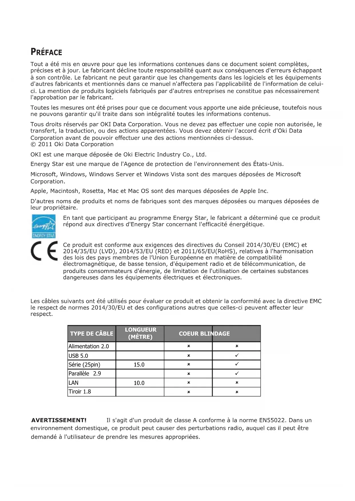 Tout a été mis en œuvre pour que les informations contenues dans ce document soient complètes, précises et à jour. Le fabricant décline toute responsabilité quant aux conséquences d'erreurs échappant à son contrôle. Le fabricant ne peut garantir que les changements dans les logiciels et les équipements d'autres fabricants et mentionnés dans ce manuel n'affectera pas l'applicabilité de l'information de celui- ci. La mention de produits logiciels fabriqués par d'autres entreprises ne constitue pas nécessairement l'approbation par le fabricant. Toutes les mesures ont été prises pour que ce document vous apporte une aide précieuse, toutefois nous ne pouvons garantir qu'il traite dans son intégralité toutes les informations contenus. Tous droits réservés par OKI Data Corporation. Vous ne devez pas effectuer une copie non autorisée, le transfert, la traduction, ou des ac tions apparentées. Vous devez obtenir l'accord écrit d'Oki Data Corporation avant de pouvoir effectuer une des actions mentionnées ci-dessus. © 2011 Oki Data Corporation OKI est une marque déposée de Oki Electric Industry Co., Ltd. Energy Star est une marque de l'Agence de protection de l'environnement des États-Unis. Microsoft, Windows, Windows Server et Windows Vista sont des marques déposées de Microsoft Corporation. Apple, Macintosh, Rosetta, Mac et Mac OS sont des marques déposées de Apple Inc. D'autres noms de produits et noms de fabriques sont des marques déposées ou marques déposées de leur propriétaire. En tant que participant au programme Energy Star, le fabricant a déterminé que ce produit répond aux directives d'Energy Star concernant l'efficacité énergétique. Ce produit est conforme aux exigences des directives du Conseil 2014/30/EU (EMC) et 2014/35/EU (LVD), 2014/53/EU (RED)et 2011/65/EU(RoHS), relatives à l'harmonisation des lois des pays membres de l’Union Européenne en matière de compatibilité électromagnétique, de basse tension, d'équipement radio et de télécommunication, de produits consommateurs d'énergie, de limitation de l'utilisation de certaines substances dangereuses dans les équipements électriques et électroniques. Les câbles suivants ont été utilisés pour évaluer ce produit et obtenir la conformité avec la directive EMC le respect de normes 2014/30/EU et des configurations autres que celles-ci peuvent affecter leur respect. TYPE DE CÂBLE LONGUEUR COEUR BLINDAGE