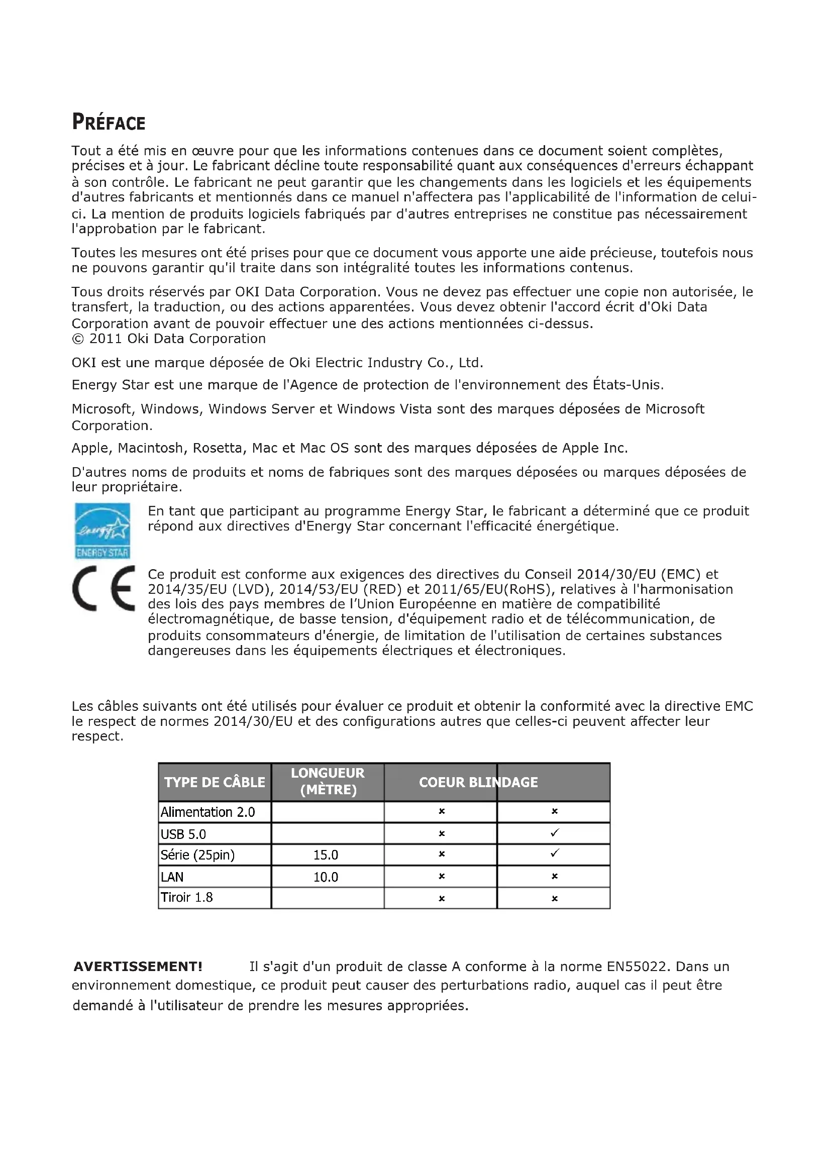 Tout a été mis en œuvre pour que les informations contenues dans ce document soient complètes, précises et à jour. Le fabricant décline toute responsabilité quant aux conséquences d'erreurs échappant à son contrôle. Le fabricant ne peut garantir que les changements dans les logiciels et les équipements d'autres fabricants et mentionnés dans ce manuel n'affectera pas l'applicabilité de l'information de celui- ci. La mention de produits logiciels fabriqués par d'autres entreprises ne constitue pas nécessairement l'approbation par le fabricant. Toutes les mesures ont été prises pour que ce document vous apporte une aide précieuse, toutefois nous ne pouvons garantir qu'il traite dans son intégralité toutes les informations contenus. Tous droits réservés par OKI Data Corporation. Vous ne devez pas effectuer une copie non autorisée, le transfert, la traduction, ou des actions apparentées. Vous devez obtenir l'accord écrit d'Oki Data Corporation avant de pouvoir effectuer une des actions mentionnées ci-dessus. © 2011 Oki Data Corporation OKI est une marque déposée de Oki Electric Industry Co., Ltd. Energy Star est une marque de l'Agence de protection de l'environnement des États-Unis. Microsoft, Windows, Windows Server et Windows Vista sont des marques déposées de Microsoft Corporation. Apple, Macintosh, Rosetta, Mac et Mac OS sont des marques déposées de Apple Inc. D'autres noms de produits et noms de fabriques sont des marques déposées ou marques déposées de leur propriétaire. En tant que participant au programme Energy Star, le fabricant a déterminé que ce produit répond aux directives d'Energy Star concernant l'efficacité énergétique. Ce produit est conforme aux exigences des directives du Conseil 2014/30/EU (EMC) et 2014/35/EU (LVD), 2014/53/EU (RED)et 2011/65/EU(RoHS), relatives à l'harmonisation des lois des pays membres de l’Union Européenne en matière de compatibilité électromagnétique, de basse tension, d'équipement radio et de télécommunication, de produits consommateurs d'énergie, de limitation de l'utilisation de certaines substances dangereuses dans les équipements électriques et électroniques. Les câbles suivants ont été utilisés pour évaluer ce produit et obtenir la conformité avec la directive EMC le respect de normes 2014/30/EU et des configurations autres que celles-ci peuvent affecter leur respect.