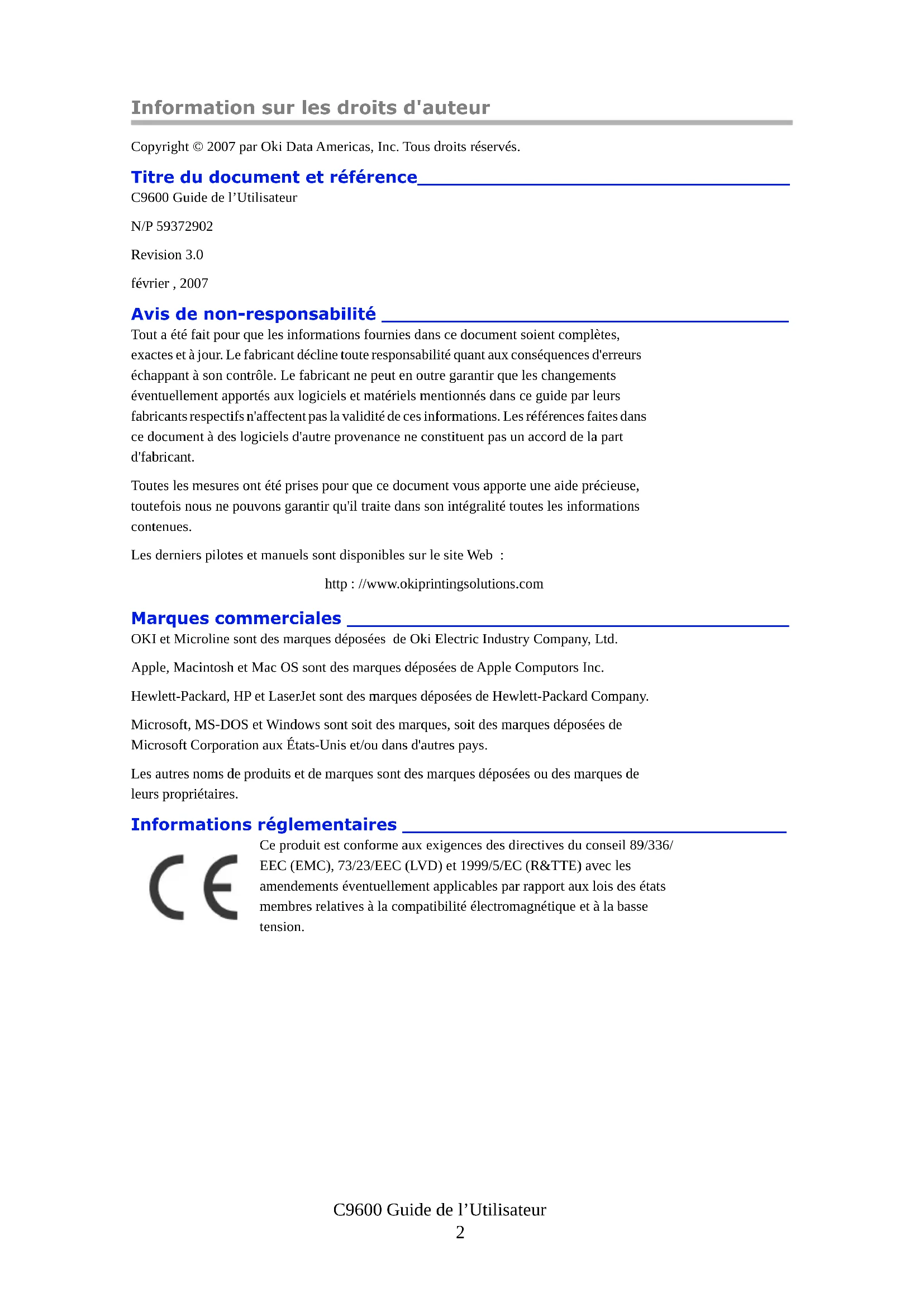 Information sur les droits d'auteur Copyright © 2007 par Oki Data Americas, Inc. Tous droits réservés. Titre du document et référence________________________________ C9600 Guide de l’Utilisateur N/P 59372902 Revision 3.0 février , 2007 Avis de non-responsabilité ___________________________________ Tout a été fait pour que les informations fournies dans ce document soient complètes, exactes et à jour. Le fabricant décline toute responsabilité quant aux conséquences d'erreurs échappant à son contrôle. Le fabricant ne peut en outre garantir que les changements éventuellement apportés aux logiciels et matériels mentionnés dans ce guide par leurs fabricants respectifs n'affectent pas la validité de ces informations. Les références faites dans ce document à des logiciels d'autre provenance ne constituent pas un accord de la part d'fabricant. Toutes les mesures ont été prises pour que ce document vous apporte une aide précieuse, toutefois nous ne pouvons garantir qu'il traite dans son intégralité toutes les informations contenues. Les derniers pilotes et manuels sont disponibles sur le site Web : http : //www.okiprintingsolutions.com Marques commerciales ______________________________________ OKI et Microline sont des marques déposées de Oki Electric Industry Company, Ltd. Apple, Macintosh et Mac OS sont des marques déposées de Apple Computors Inc. Hewlett-Packard, HP et LaserJet sont des marques déposées de Hewlett-Packard Company. Microsoft, MS-DOS et Windows sont soit des marques, soit des marques déposées de Microsoft Corporation aux États-Unis et/ou dans d'autres pays. Les autres noms de produits et de marques sont des marques déposées ou des marques de leurs propriétaires. Informations réglementaires _________________________________ Ce produit est conforme aux exigences des directives du conseil 89/336/ EEC (EMC), 73/23/EEC (LVD) et 1999/5/EC (R&TTE) avec les amendements éventuellement applicables par rapport aux lois des états membres relatives à la compatibilité électromagnétique et à la basse tension.Guide de l’Utilisateur C9600 > 3