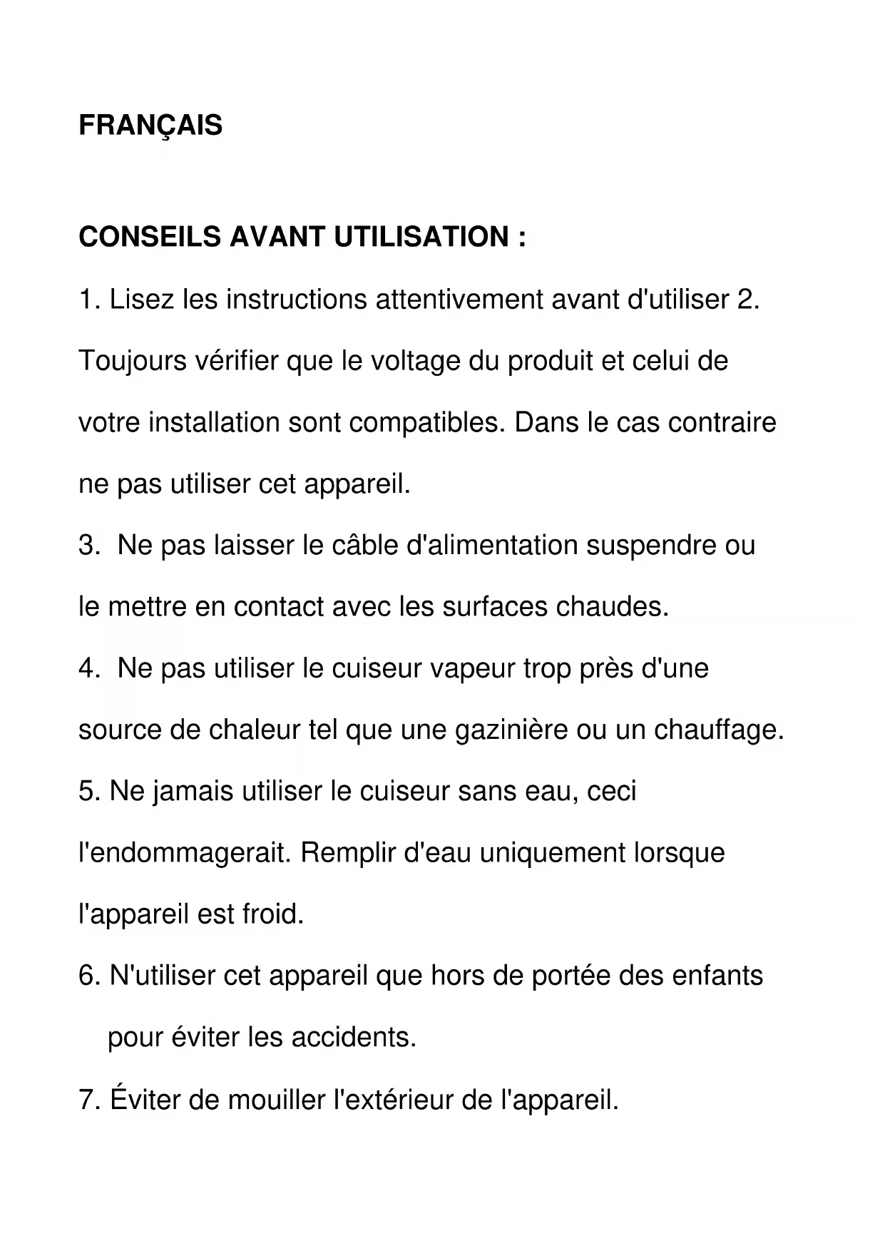 7. Éviter de mouiller l'extérieur de l'appareil.8. Faites attention à ne pas vous brûler avec la vapeur qui