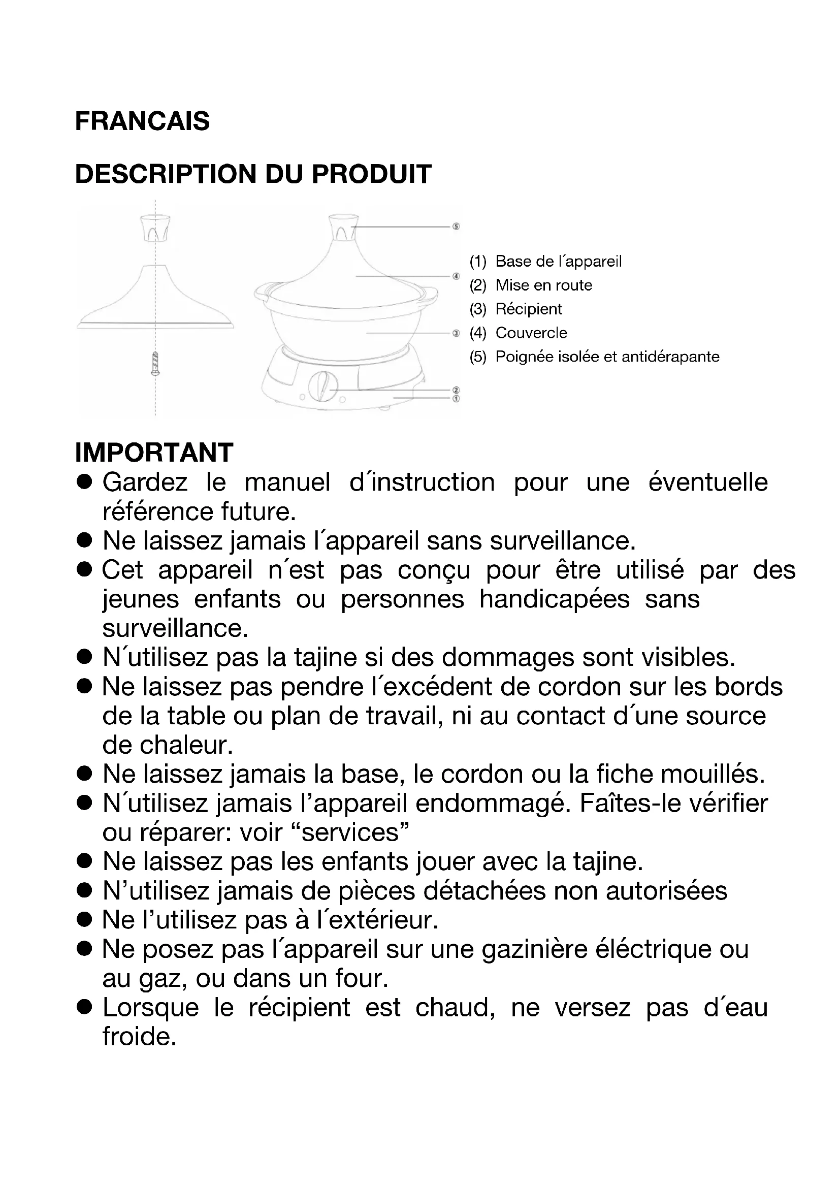 IMPORTANT l Gardez le manuel d´instruction pour une éventuelle référence future. l Ne laissez jamais l´appareil sans surveillance. l Cet appareil n´est pas conçu pour être utilisé par des jeunes enfants ou personnes handicapées sans surveillance. l N´utilisez pas la tajine si des dommages sont visibles. l Ne laissez pas pendre l´excédent de cordon sur les bords de la table ou plan de travail, ni au contact d´une source de chaleur. l Ne laissez jamais la base, le cordon ou la fiche mouillés. l N´utilisez jamais l’appareil endommagé. Faîtes-le vérifier ou réparer: voir “services” l Ne laissez pas les enfants jouer avec la tajine. l N’utilisez jamais de pièces détachées non autorisées l Ne l’utilisez pas à l´extérieur. l Ne posez pas l´appareil sur une gazinière éléctrique ou au gaz, ou dans un four. l Lorsque le récipient est chaud, ne versez pas d´eau froide.l Ne pas mettre directement le récipient sur le feu. l Cet appareil peut être utilisé par des personnes dont les capacités physiques, sensorielles ou mentales sont réduites ou dont l’expérience ou les connaissances ne sont pas suffisantes, à condition qu’elles bénéficient d’une surveillance ou qu’elles aient reçu des instructions quant à l’utilisation de l’appareil en toute sécurité et qu’elles en comprennent bien les dangers potentiels. l Les enfants doivent être surveillés pour s´assurer qu´ils ne jouent pas avec l´appareil. l L’appareil ne doit pas être utilisé s’il a chuté, s’il y a des signes visibles de dommages ou en cas de fuite l N’utilisez pas l’appareil si son câble d’alimentation ou sa prise est endommagée, s’il ne fonctionne pas correctement, s’il a été abimé ou s’il est tombé. Si le câble d’alimentation est endommagé, il doit être remplacé par le fabricant ou son agent ou encore par une personne qualifiée afin d’éviter tout risque. l Cet appareil peut être utilisé par des enfants âgés d’au moins 8 ans, à condition qu’ils bénéficient d’une surveillance ou qu’ils aient reçu des instructions quant à l’utilisation de l’appareil en toute sécurité et qu’ils comprennent bien les dangers encourus. l Le nettoyage et l’entretien par l’utilisateur ne doivent pas être effectués par des enfants, à moins qu’ils ne soient âgés de plus de 8 ans et qu’ils soient sous la surveillance d’un adulte. l Conserver l’appareil et son câble hors de portée des enfants âgés de moins 8 ans. l Lors de l’utilisation d’appareils électriques, des précautions de sécurité doivent toujours être prises pour prévenir tout risque d’incendie, de choc électrique et/ou de blessure en cas de mauvaise utilisation.l Vérifier que le voltage indiqué sur la plaque signalétique de l’appareil correspond bien à celui de votre installation électrique. Si ce n’est pas le cas, adressez-vous au revendeur et ne branchez pas l’appareil. l Ne jamais laisser l’appareil sans surveillance lorsqu’il est en fonctionnement. l Ne jamais ouvrir l’appareil de face, toujours vous positionner légèrement sur le côté pour ne pas vous brûler avec la vapeur. l Veuillez conserver ce document à disposition et le remettre au futur propriétaire en cas de cession de votre appareil. l Votre appareil a été conçu pour un usage domestique seulement. Elle n’a pas été conçue pour être utilisée dans les cas suivants qui ne sont pas couverts par la garantie : – dans des coins de cuisines réservés au personnel dans des magasins, bureaux et autres environnements professionnels, – dans des fermes auberges, – par les clients des hôtels, motels et autres environnements à caractère résidentiel, – dans des environnements de type chambres d’hôtes.MODALITES A SUIVRE AVANT LA PREMIERE UTILISATION