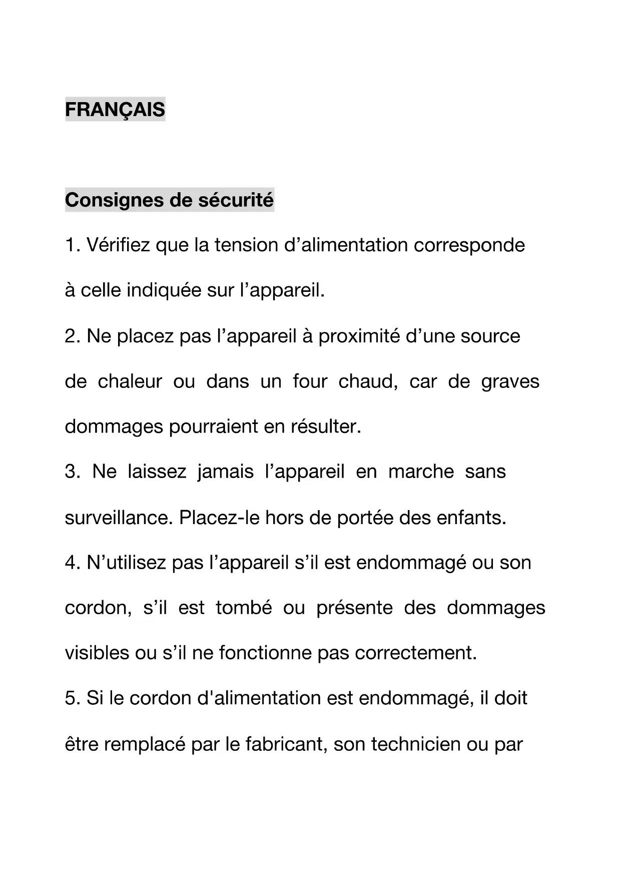 | Consignes de sécurité | Ne pas immerger l'appareil dans l'eau, utiliser sur une surface stable |