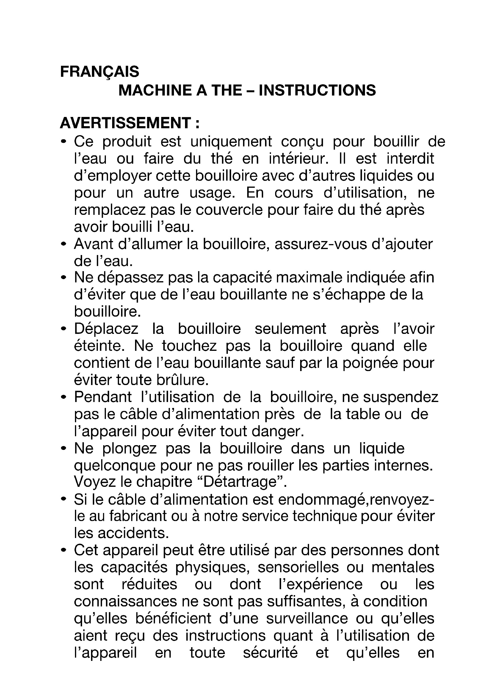 Ce produit est uniquement conçu pour bouillir de l’eau ou faire du thé en intérieur. Il est interdit d’employer cette bouilloire avec d’autres liquides ou pour un autre usage. En cours d’utilisation, ne remplacez pas le couvercle pour faire du thé après avoir bouilli l’eau.