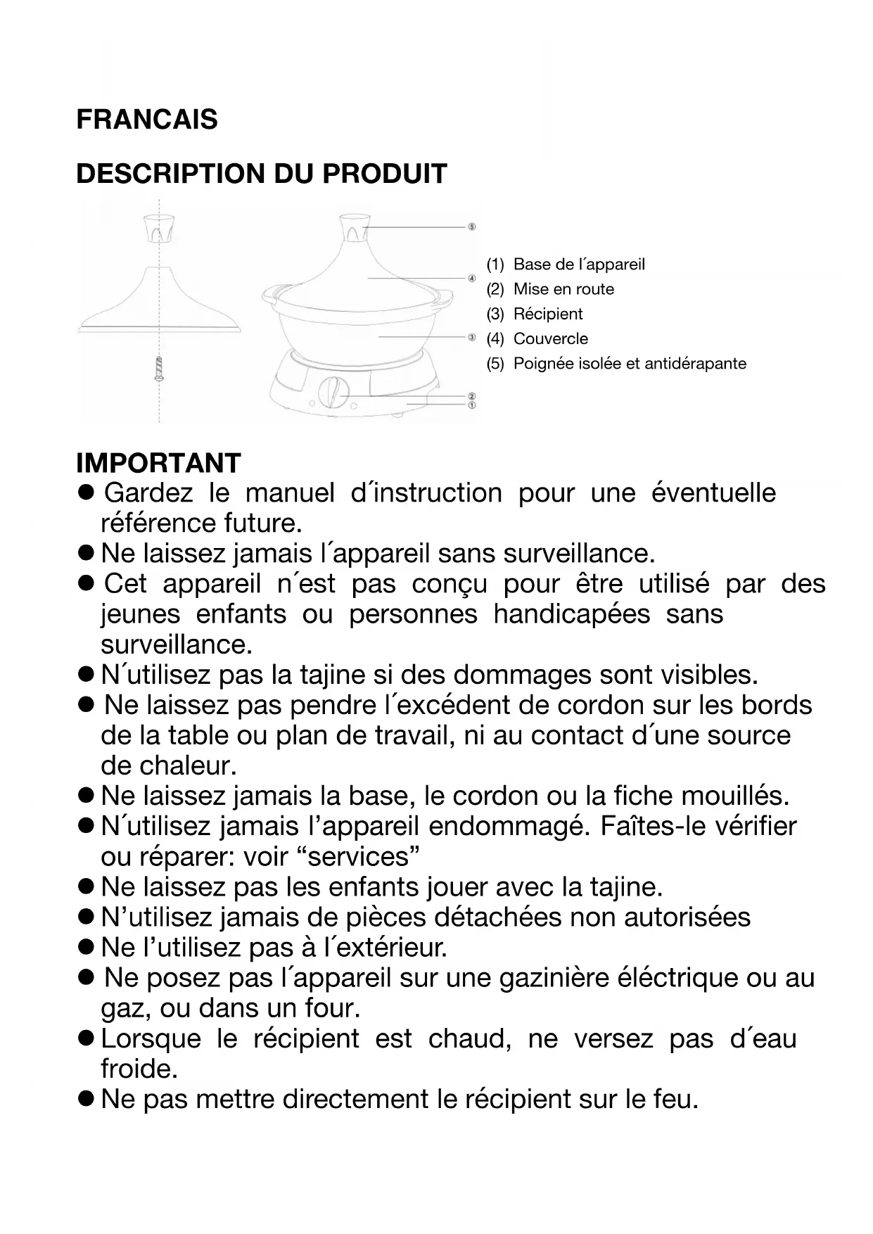 IMPORTANT l Gardez le manuel d´instruction pour une éventuelle référence future. l Ne laissez jamais l´appareil sans surveillance. l Cet appareil n´est pas conçu pour être utilisé par des jeunes enfants ou personnes handicapées sans surveillance. l N´utilisez pas la tajine si des dommages sont visibles. l Ne laissez pas pendre l´excédent de cordon sur les bords de la table ou plan de travail, ni au contact d´une source de chaleur. l Ne laissez jamais la base, le cordon ou la fiche mouillés. l N´utilisez jamais l’appareil endommagé. Faîtes-le vérifier ou réparer: voir “services” l Ne laissez pas les enfants jouer avec la tajine. l N’utilisez jamais de pièces détachées non autorisées l Ne l’utilisez pas à l´extérieur. l Ne posez pas l´appareil sur une gazinière éléctrique ou au gaz, ou dans un four. l Lorsque le récipient est chaud, ne versez pas d´eau froide. l Ne pas mettre directement le récipient sur le feu.l Cet appareil n’est pas conçu pour être utilisé par des personnes (y compris des enfants) ayant des déficiences physiques, sensorielles voire mentales ; ou manquant de connaissances et expériences. Ces personnes doivent être supervisées et formées sur l’utilisation de l’appareil par une personne responsable de leur sécurité. l Les enfants doivent être surveillés pour s´assurer qu´ils ne jouent pas avec l´appareil. l L’appareil ne doit pas être utilisé s’il a chuté, s’il y a des signes visibles de dommages ou en cas de fuite l N’utilisez pas l’appareil si son câble d’alimentation ou sa prise est endommagée, s’il ne fonctionne pas correctement, s’il a été abimé ou s’il est tombé. Si le câble d’alimentation est endommagé, il doit être remplacé par le fabricant ou son agent ou encore par une personne qualifiée afin d’éviter tout risque. l Cet appareil peut être utilisé par des enfants âgés d’au moins 8 ans, à condition qu’ils bénéficient d’une surveillance ou qu’ils aient reçu des instructions quant à l’utilisation de l’appareil en toute sécurité et qu’ils comprennent bien les dangers encourus. l Le nettoyage et l’entretien par l’utilisateur ne doivent pas être effectués par des enfants, à moins qu’ils ne soient âgés de plus de 8ans et qu’ils soient sous la surveillance d’un adulte. l Conserver l’appareil et son câble hors de portée des enfants âgés de moins 8ans. l Lors de l’utilisation d’appareils électriques, des précautions de sécurité doivent toujours être prises pour prévenir tout risque d’incendie, de choc électrique et/ou de blessure en cas de mauvaise utilisation. l Vérifier que le voltage indiqué sur la plaque signalétique de l’appareil correspond bien à celui de votre installationélectrique. Si ce n’est pas le cas, adressez-vous au revendeur et ne branchez pas l’appareil. l Ne jamais laisser l’appareil sans surveillance lorsqu’il est en fonctionnement. l Veuillez conserver ce document à disposition et le remettre au futur propriétaire en cas de cession de votre appareil. l Ne jamais ouvrir l’appareil de face, toujours vous positionner légèrement sur le côté pour ne pas vous brûler avec la vapeur. l L’appareil ne doit pas être utilisé s’il a chuté, s’il y a des signes visibles de dommages ou en cas de fuite.