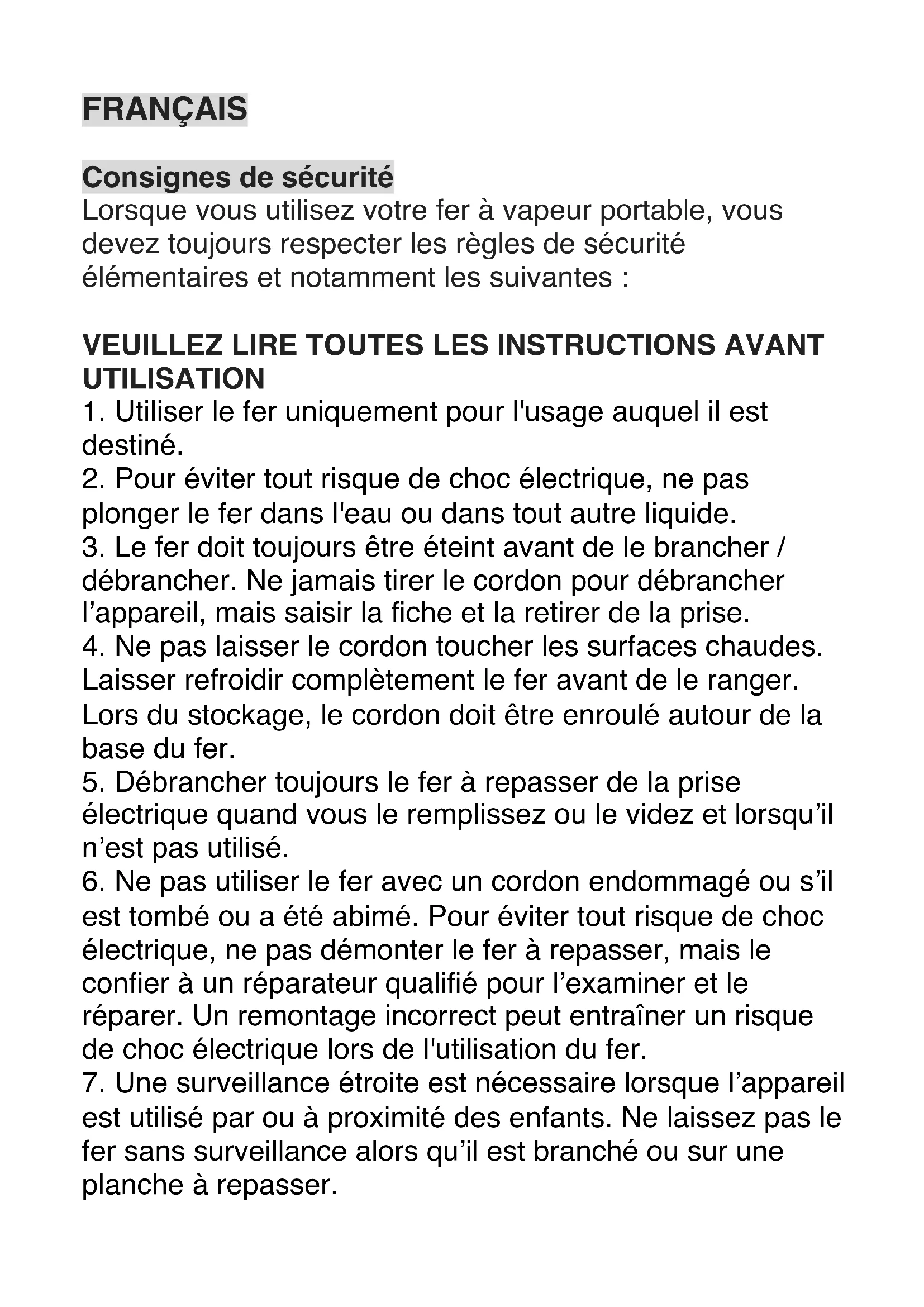 6. Ne pas utiliser le fer avec un cordon endommagé ou s’il