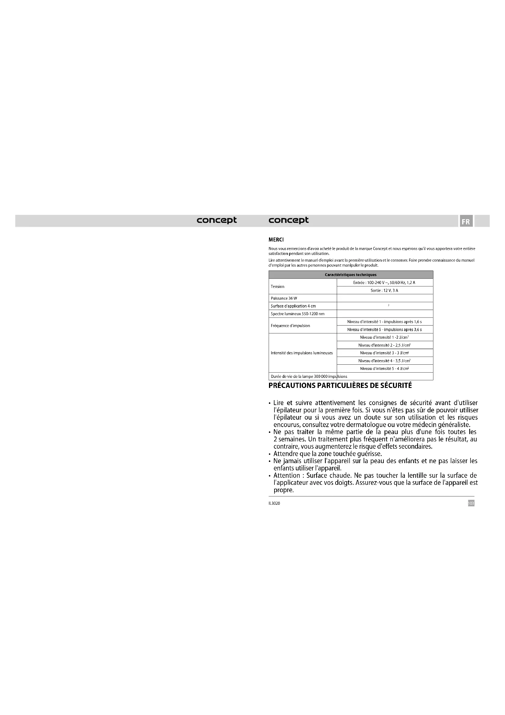 IL3020 MERCI Nous vous remercions d’avoir acheté le produit de la marque Concept et nous espérons qu’il vous apportera votre entière satisfaction pendant son utilisation. Lire attentivement le manuel d’emploi avant la première utilisation et le conserver. Faire prendre connaissance du manuel d’emploi par les autres personnes pouvant manipuler le produit. Caractéristiques techniques Tension Entrée : 100-240 V ~, 50/60 Hz, 1,2 A Sortie: 12 V, 3 A Puissance 36 W Surface d'application 4 cm