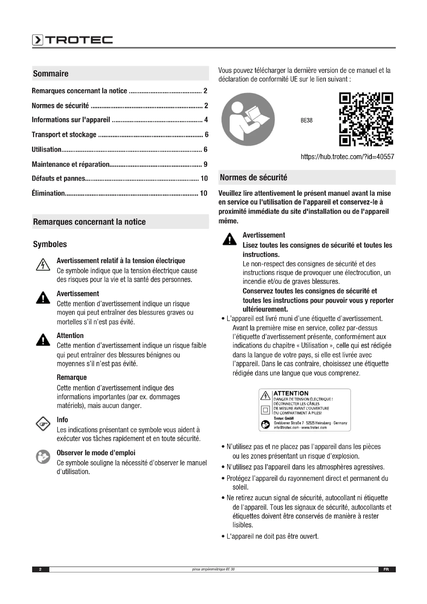 - Élimination Remarques concernant la notice Symboles Avertissement relatif à la tension électrique Ce symbole indique que la tension électrique cause des risques pour la vie et la santé des personnes. Avertissement Cette mention d’avertissement indique un risque moyen qui peut entraîner des blessures graves ou mortelles s’il n’est pas évité. Attention Cette mention d’avertissement indique un risque faible qui peut entraîner des blessures bénignes ou moyennes s’il n’est pas évité. Remarque Cette mention d’avertissement indique des informations importantes (par ex. dommages matériels), mais aucun danger. Info Les indications présentant ce symbole vous aident à exécuter vos tâches rapidement et en toute sécurité. Observer le mode d’emploi Ce symbole souligne la nécessité d’observer le manuel d'utilisation. Vous pouvez télécharger la dernière version de ce manuel et la déclaration de conformitéUE sur le lien suivant: BE38 https://hub.trotec.com/?id=40557 Normes de sécurité Veuillez lire attentivement le présent manuel avant la mise en service ou l'utilisation de l'appareil et conservez-le à proximité immédiate du site d'installation ou de l'appareil même. Avertissement Lisez toutes les consignes de sécurité et toutes les instructions. Le non-respect des consignes de sécurité et des instructions risque de provoquer une électrocution, un incendie et/ou de graves blessures. Conservez toutes les consignes de sécurité et toutes les instructions pour pouvoir vous y reporter ultérieurement. p. 10