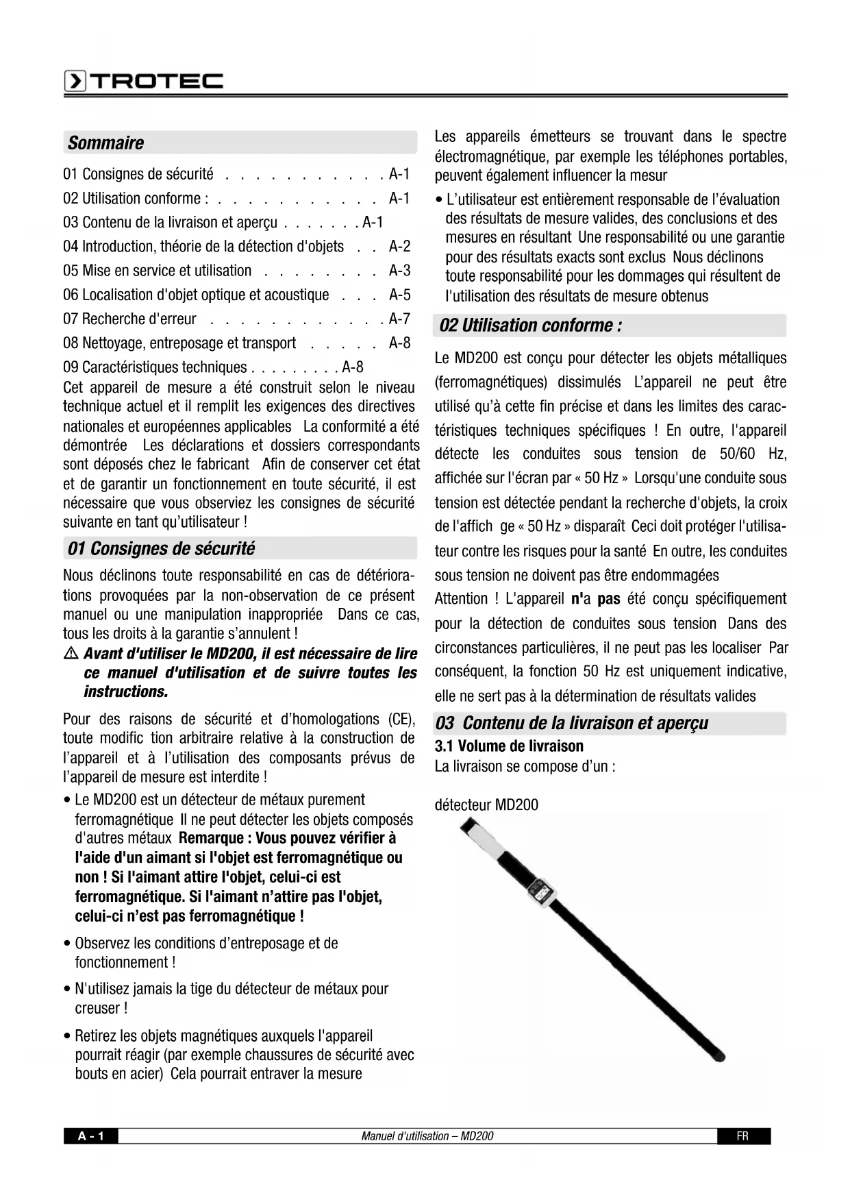 Manuel d'utilisation – MD200 Sommaire 01 Consignes de sécurité ...A-1 02 Utilisation conforme: ...A-1 03 Contenu de la livraison et aperçu ...A-1 04 Introduction, théorie de la détection d'objets ...A-2 05 Mise en service et utilisation ...A-3 06 Localisation d'objet optique et acoustique ...A-5 07 Recherche d'erreur ...A-7 08 Nettoyage, entreposage et transport ...A-8 09 Caractéristiques techniques ...A-8 Cet appareil de mesure a été construit selon le niveau technique actuel et il remplit les exigences des directives nationales et européennes applicables La conformité a été démontrée Les déclarations et dossiers correspondants sont déposés chez le fabricant Afin de conserver cet état et de garantir un fonctionnement en toute sécurité, il est nécessaire que vous observiez les consignes de sécurité suivante en tant qu’utilisateur! 01 Consignes de sécurité Nous déclinons toute responsabilité en cas de détériora- tions provoquées par la non-observation de ce présent manuel ou une manipulation inappropriée Dans ce cas, tous les droits à la garantie s’annulent! m Avant d'utiliser le MD200, il est nécessaire de lire ce manuel d'utilisation et de suivre toutes les instructions. Pour des raisons de sécurité et d’homologations (CE), toute modific tion arbitraire relative à la construction de l’appareil et à l’utilisation des composants prévus de l’appareil de mesure est interdite!