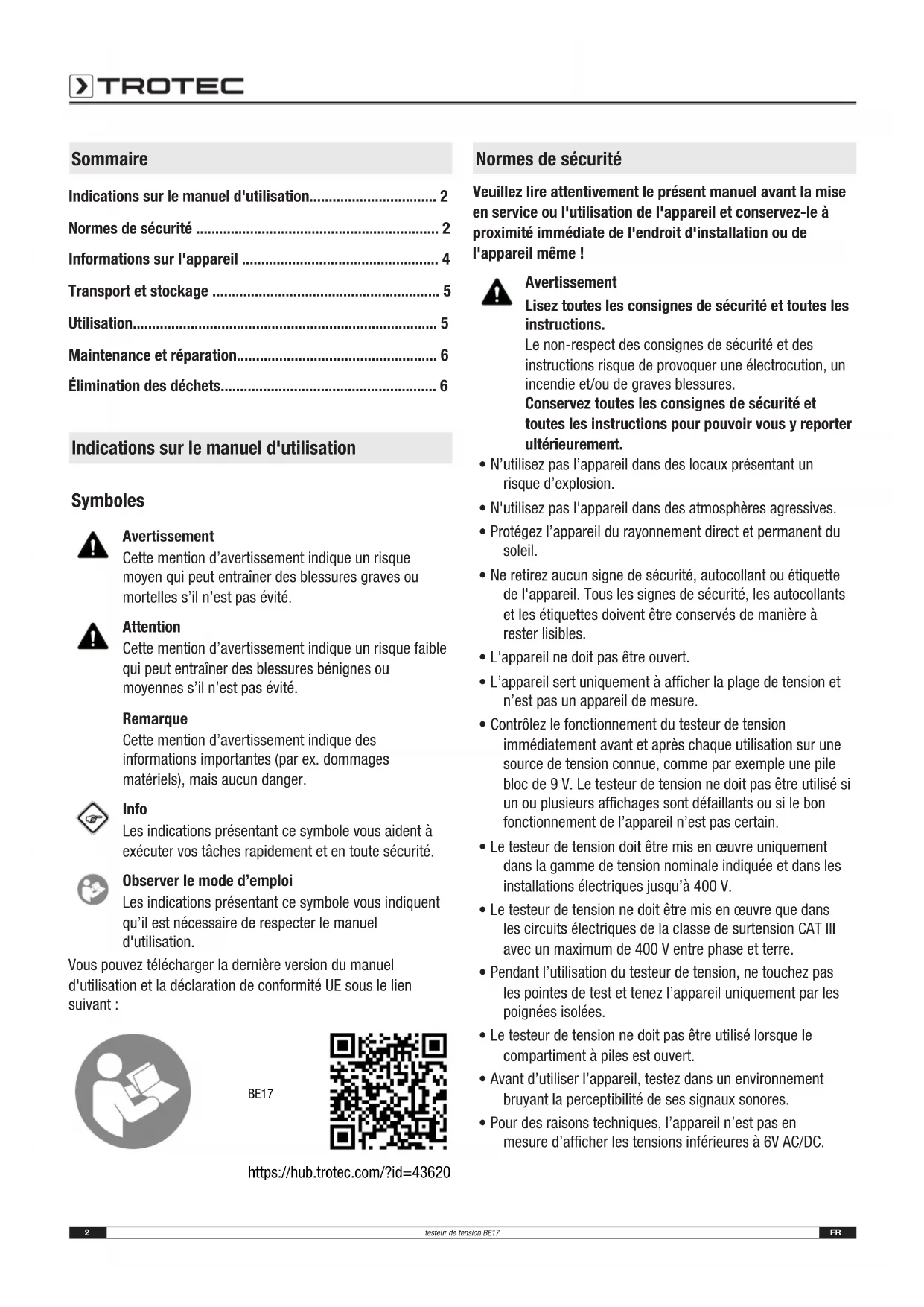 - Élimination des déchets Indications sur le manuel d'utilisation Symboles Avertissement Cette mention d’avertissement indique un risque moyen qui peut entraîner des blessures graves ou mortelles s’il n’est pas évité. Attention Cette mention d’avertissement indique un risque faible qui peut entraîner des blessures bénignes ou moyennes s’il n’est pas évité. Remarque Cette mention d’avertissement indique des informations importantes (par ex. dommages matériels), mais aucun danger. Info Les indications présentant ce symbole vous aident à exécuter vos tâches rapidement et en toute sécurité. Observer le mode d’emploi Les indications présentant ce symbole vous indiquent qu’il est nécessaire de respecter le manuel d'utilisation. Vous pouvez télécharger la dernière version du manuel d'utilisation et la déclaration de conformité UE sous le lien suivant: BE17 https://hub.trotec.com/?id=43620 Normes de sécurité Veuillez lire attentivement le présent manuel avant la mise en service ou l'utilisation de l'appareil et conservez-le à proximité immédiate de l'endroit d'installation ou de l'appareil même! Avertissement Lisez toutes les consignes de sécurité et toutes les instructions. Le non-respect des consignes de sécurité et des instructions risque de provoquer une électrocution, un incendie et/ou de graves blessures. Conservez toutes les consignes de sécurité et toutes les instructions pour pouvoir vous y reporter ultérieurement. p. 6