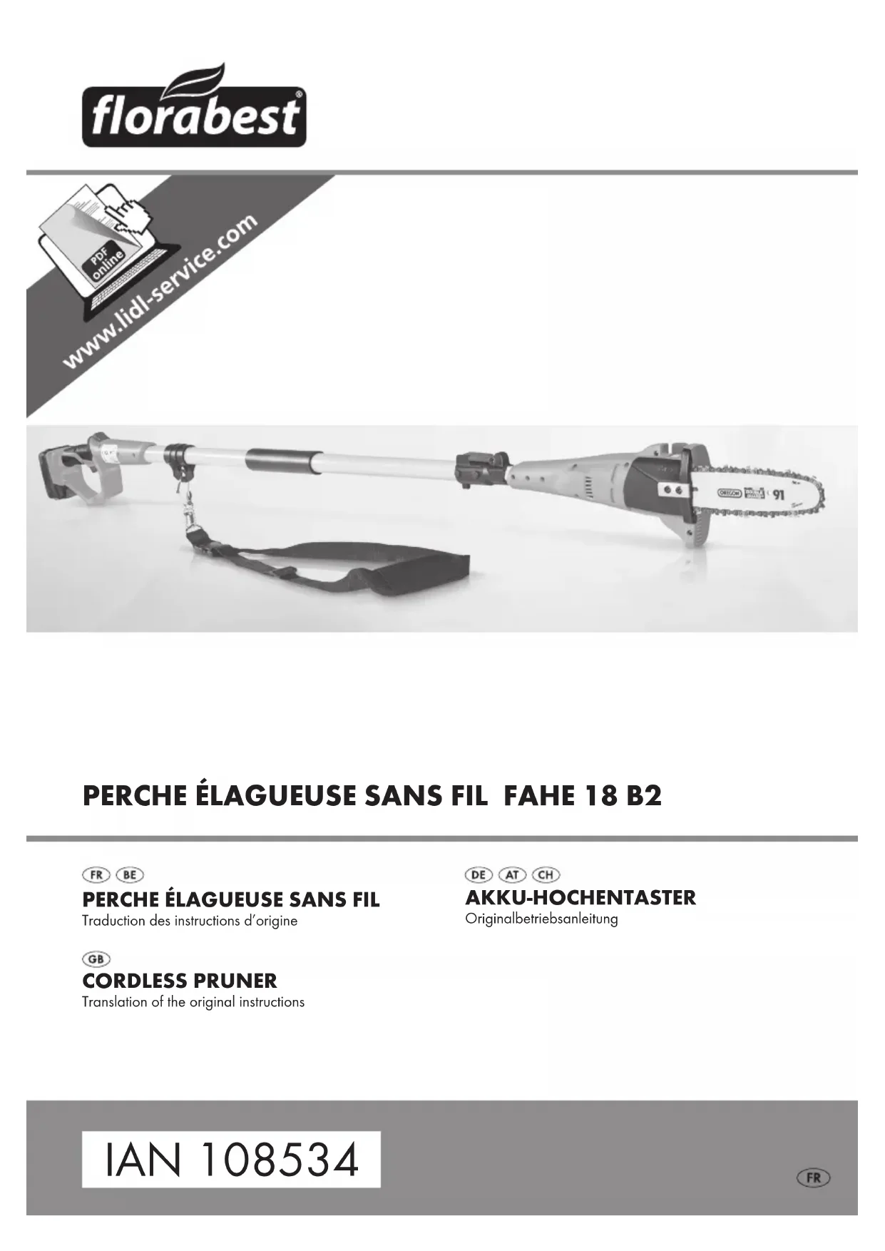 FAHE 18 B2 Introduction Toutes nos félicitations pour l'achat de votre nouvel appareil. Ainsi, vous venez d'opter pour un produit de grande qualité. Le mode d'emploi fait partie de ce produit. Il contient des remarques importantes concernant la sécurité, l'usage et la mise au rebut. Avant d'utiliser le produit, veuillez vous familiariser avec toutes les consignes d'utilisation et de sécurité. N'utilisez le produit que conformément aux consignes et pour les domaines d'utilisation prévus. Si vous cédez le produit à un tiers, remettez-lui égale- ment tous les documents. Usage conforme Cet appareil sert à élaguer les arbres. Il n'a pas été conçu pour scier les branches de fort diamètre, abattre les arbres et scier des matériaux comme la maçonnerie, le plastique ou des produits alimen- taires. N'utilisez l'appareil que conformément aux consignes et pour les domaines d'utilisation prévus. L'appareil n'est pas conçu pour un usage commer- cial. L'appareil est conçu pour être utilisé par des adultes. Cet appareil n'est pas destiné à l'usage par des personnes (enfants compris) présentant des aptitudes physiques, sensorielles ou intellec- tuelles restreintes, ou qui manquent de l'expérience et/ou des connaissances requises. Il est interdit d'utiliser l'appareil en cas de pluie ou dans un environnement humide. Toute autre utilisation ou modification de l'appareil est considérée comme étant non conforme et s'accompagne de risques d'accident non négligeables. Le fabricant décline toute responsabilité en cas de dommages résultant d'une utilisation non conforme. Équipement Perche télescopique Fermeture rapide pour perche télescopique Poignée Longeron de l'appareil Verrouillage de sécurité Interrupteur MARCHE / ARRÊT Poignée arrière Bloc d'accu Touche d'état de l'accu LED d'affichage de l'accu Touche pour déverrouiller le bloc d'accu Œillet Ouïes de ventilation Regard de niveau d'huile Butée Lame Chaîne de scie Cache de pignon Vis Couvercle du réservoir à huile Guide-lame Alésage de lame Rail de guidage Pignon Huileur par gouttes Goupille de tension de chaîne Vis de tension de la chaîne Chargeur rapide LED rouge de contrôle de charge LED verte de contrôle de charge Bandoulière Gaine protectrice pour la lame Huile pour chaîne bio Outil de montage Matériel livré 1 perche élagueuse sans fil FAHE 18 B2 1 chargeur rapide FAHE 18 B2-2 pour accu 1 bloc d'accu FAHE 18 B2-1 1 bandoulière 1 gaine protectrice pour la lame 1 Lame 1 chaîne de scie 100 ml d'huile pour chaîne bio 1 outil de montage 1 mode d'emploi3 FAHE 18 B2