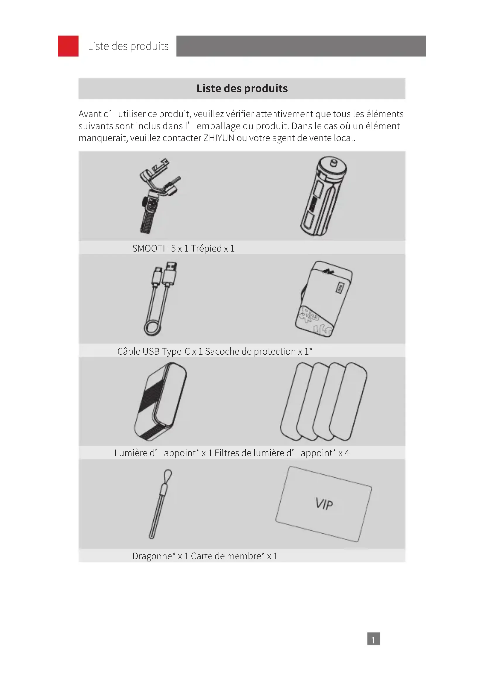 Cartedecontact1 Liste des produits Liste des produits SMOOTH 5 x 1 Trépied x 1 Câble USB Type-C x 1 Sacoche de protection x 1* Lumière d’appoint* x 1 Filtres de lumière d’appoint* x 4 Dragonne* x 1 Carte de membre* x 1 Avant d’utiliser ce produit, veuillez vérifier attentivement que tous les éléments suivants sont inclus dans l’emballage du produit. Dans le cas où un élément manquerait, veuillez contacter ZHIYUN ou votre agent de vente local.2 Liste des produits Guide de démarrage rapide x 1 Les éléments marqués d’un « ** » sont inclus dans le COMBO SMOOTH 5.3 Découvrez le SMOOTH 5 Découvrez le SMOOTH 5