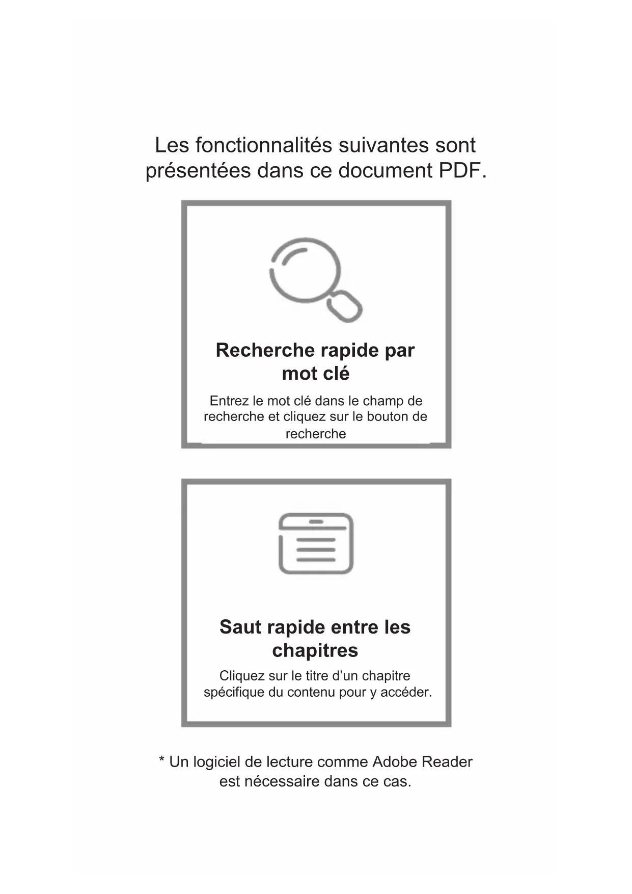 Les fonctionnalités suivantes sont présentées dans ce document PDF. Recherche rapide par mot clé Entrez le mot clé dans le champ de recherche et cliquez sur le bouton de recherche Saut rapide entre les chapitres Cliquez sur le titre d’un chapitre spécique du contenu pour y accéder.