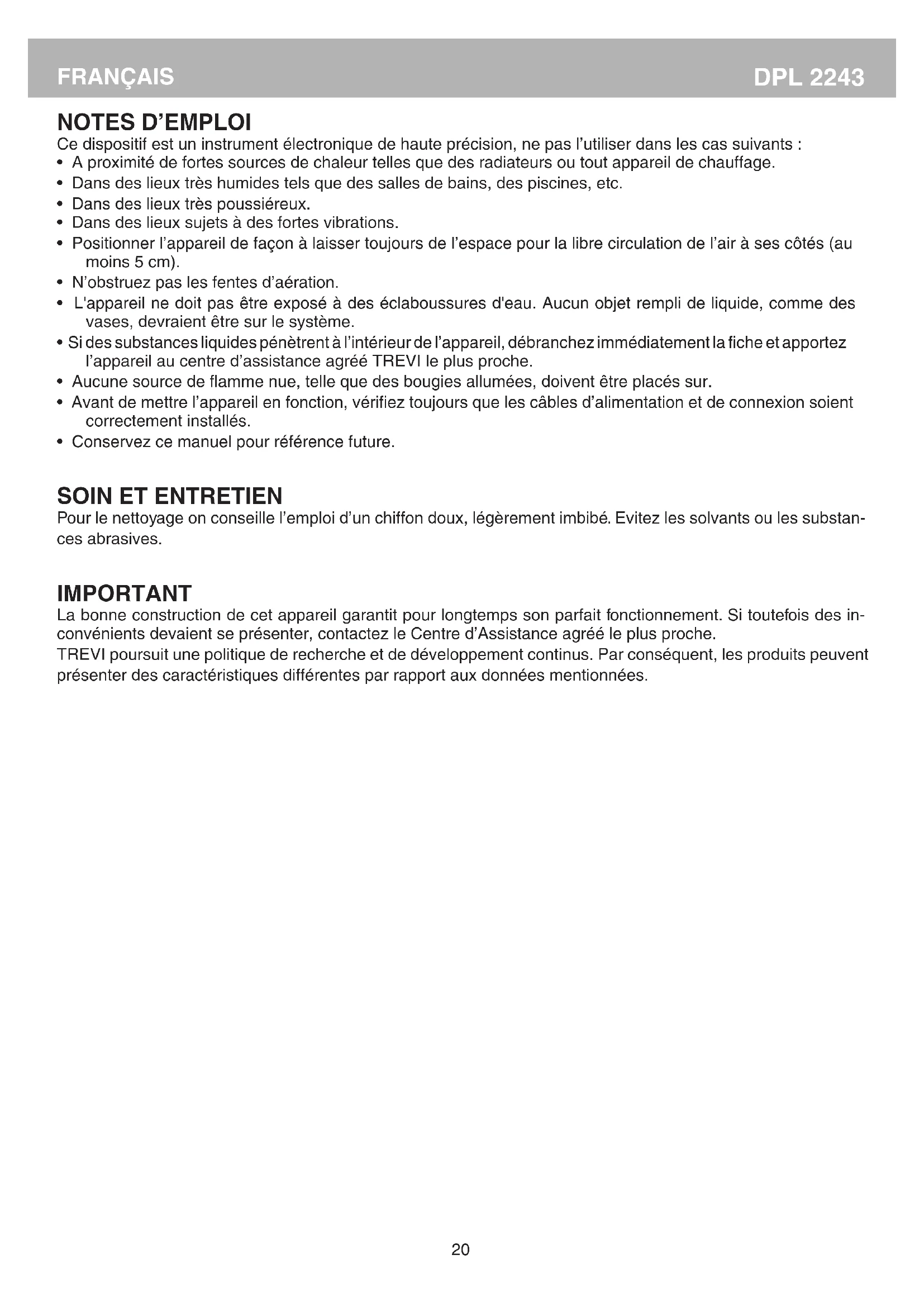 Pour le nettoyage on conseille l’emploi d’un chiffon doux, légèrement imbibé. Evitez les solvants ou les substan- ces abrasives. IMPORTANT La bonne construction de cet appareil garantit pour longtemps son parfait fonctionnement. Si toutefois des in- convénients devaient se présenter, contactez le Centre d’Assistance agréé le plus proche. TREVI poursuit une politique de recherche et de développement continus. Par conséquent, les produits peuvent présenter des caractéristiques différentes par rapport aux données mentionnées.21 DPL 2243 FRANÇAIS
