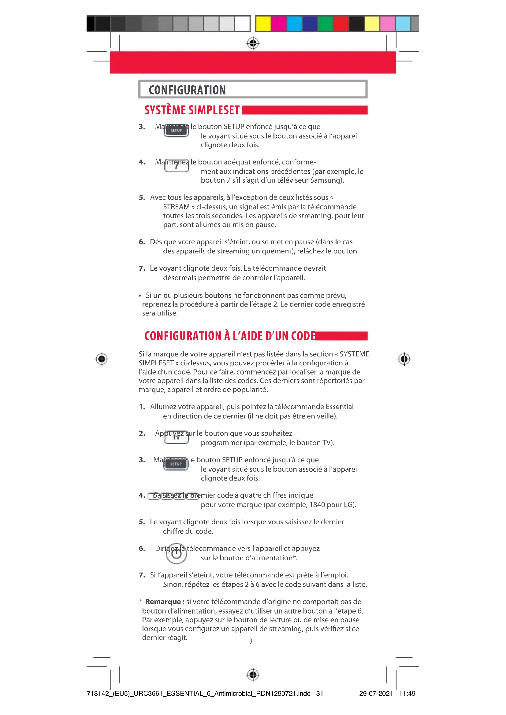 - Remarque : si votre télécommande d’origine ne comportait pas de bouton d’alimentation, essayez d’utiliser un autre bouton à l’étape 6. Par exemple, appuyez sur le bouton de lecture ou de mise en pause lorsque vous congurez un appareil de streaming, puis vériez si ce dernier réagit. 713142_(EU5)_URC3661_ESSENTIAL_6_Antimicrobial_RDN1290721.indd 31713142_(EU5)_URC3661_ESSENTIAL_6_Antimicrobial_RDN1290721.indd 31 29-07-2021 11:4929-07-2021 11:4932 CONFIGURATION