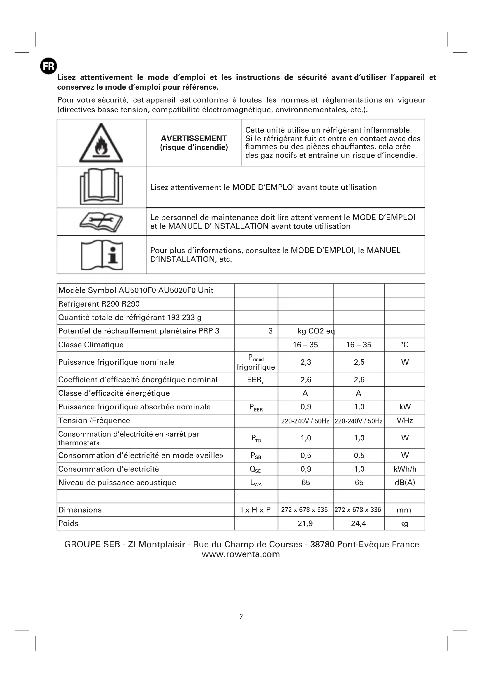 Lisez attentivement le mode d’emploi et les instructions de sécurité avant d’utiliser l’appareil et conservez le mode d’emploi pour référence. Pour votre sécurité, cet appareil est conforme à toutes les normes et réglementations en vigueur (directives basse tension, compatibilité électromagnétique, environnementales, etc.). AVERTISSEMENT (risque d’incendie) Cette unité utilise un réfrigérant inflammable. Si le réfrigérant fuit et entre en contact avec des flammes ou des pièces chauffantes, cela crée des gaz nocifs et entraîne un risque d’incendie. Lisez attentivement le MODE D’EMPLOI avant toute utilisation Le personnel de maintenance doit lire attentivement le MODE D’EMPLOI et le MANUEL D’INSTALLATION avant toute utilisation Pour plus d’informations, consultez le MODE D’EMPLOI, le MANUEL D’INSTALLATION, etc. Modèle Symbol AU5010F0 AU5020F0 Unit Refrigerant R290 R290 Quantité totale de réfrigérant 193 233 g Potentiel de réchauffement planétaire PRP 3 3 kg CO2 eq Classe Climatique 16 – 35 16 – 35 °C Puissance frigorifique nominale