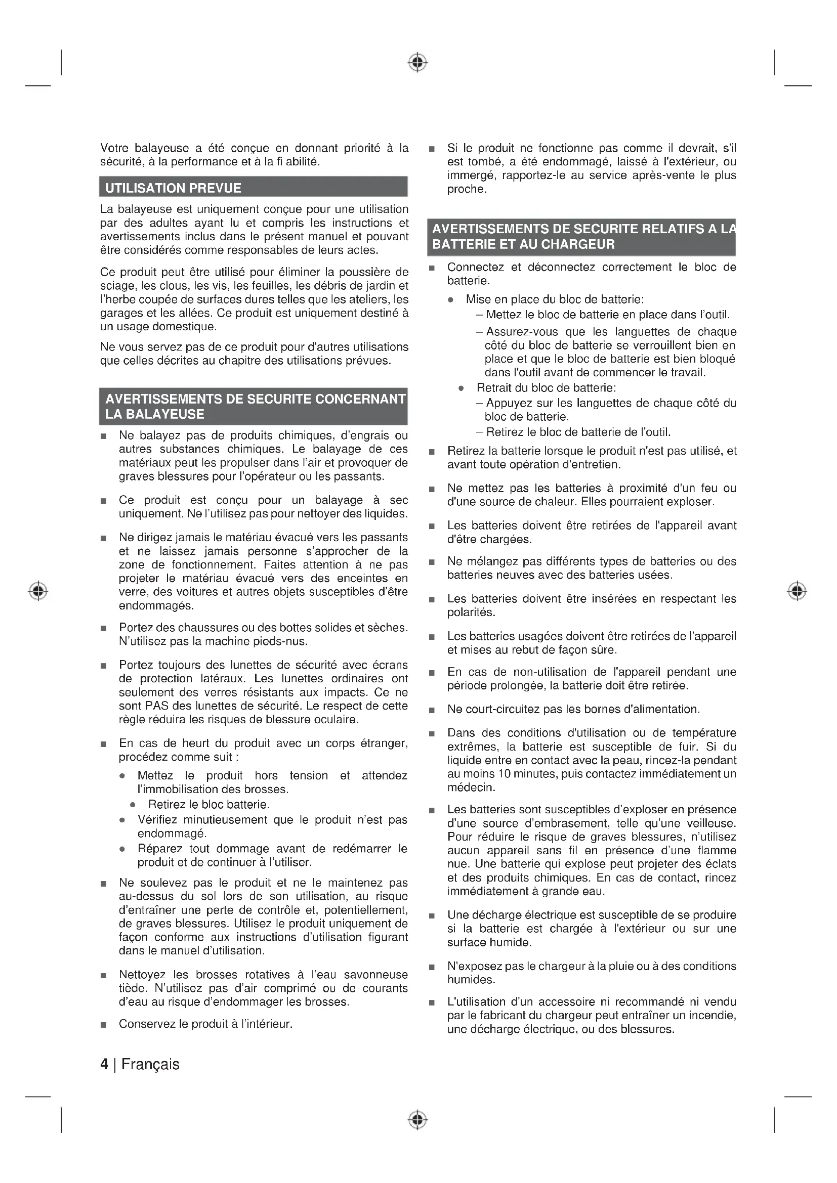 LA BALAYEUSE Ŷ Ne balayez pas de produits chimiques, d’engrais ou autres substances chimiques. Le balayage de ces matériaux peut les propulser dans l’air et provoquer de graves blessures pour l’opérateur ou les passants. Ŷ Ce produit est conçu pour un balayage à sec uniquement. Ne l’utilisez pas pour nettoyer des liquides. Ŷ Ne dirigez jamais le matériau évacué vers les passants et ne laissez jamais personne s’approcher de la zone de fonctionnement. Faites attention à ne pas projeter le matériau évacué vers des enceintes en verre, des voitures et autres objets susceptibles d’être endommagés. Ŷ Portez des chaussures ou des bottes solides et sèches. N’utilisez pas la machine pieds-nus. Ŷ Portez toujours des lunettes de sécurité avec écrans de protection latéraux. Les lunettes ordinaires ont seulement des verres résistants aux impacts. Ce ne sont PAS des lunettes de sécurité. Le respect de cette règle réduira les risques de blessure oculaire. Ŷ En cas de heurt du produit avec un corps étranger, procédez comme suit : Ɣ Mettez le produit hors tension et attendez l’immobilisation des brosses. Ɣ Retirez le bloc batterie. Ɣ Vérifiez minutieusement que le produit n’est pas endommagé. Ɣ Réparez tout dommage avant de redémarrer le produit et de continuer à l’utiliser. Ŷ Ne soulevez pas le produit et ne le maintenez pas au-dessus du sol lors de son utilisation, au risque d’entraîner une perte de contrôle et, potentiellement, de graves blessures. Utilisez le produit uniquement de façon conforme aux instructions d’utilisation figurant dans le manuel d’utilisation. Ŷ Nettoyez les brosses rotatives à l’eau savonneuse tiède. N’utilisez pas d’air comprimé ou de courants d’eau au risque d’endommager les brosses. Ŷ Conservez le produit à l’intérieur. Ŷ Si le produit ne fonctionne pas comme il devrait, s'il est tombé, a été endommagé, laissé à l'extérieur, ou immergé, rapportez-le au service après-vente le plus proche.