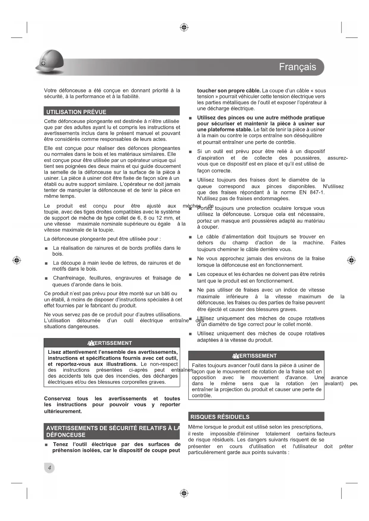 que des fraises répondant à la norme EN 847-1. 1XWLOLVH]SDVGHIUDLVHVHQGRPPDJpHV Ŷ 3RUWH] WRXMRXUV XQH SURWHFWLRQ RFXODLUH ORUVTXH YRXV utilisez la défonceuse. Lorsque cela est nécessaire, portez un masque anti poussières adapté au matériau à couper. Ŷ /H FkEOH G¶DOLPHQWDWLRQ GRLW WRXMRXUV VH WURXYHU HQ GHKRUV GX FKDPS G¶DFWLRQ GH OD PDFKLQH )DLWHV WRXMRXUVFKHPLQHUOHFkEOHGHUULqUHYRXV Ŷ 1H YRXV DSSURFKH] MDPDLV GHV HQYLURQV GH OD IUDLVH lorsque la défonceuse est en fonctionnement. Ŷ /HVFRSHDX[HWOHVpFKDUGHVQHGRLYHQWSDVrWUHUHWLUpV tant que le produit est en fonctionnement. Ŷ Ne pas utiliser de fraises avec un indice de vitesse PD[LPDOH LQIpULHXUH j OD YLWHVVH PD[LPXP GH OD défonceuse, les fraises ou des parties de fraise peuvent rWUHpMHFWpHWFDXVHUGHVEOHVVXUHVJUDYHV Ŷ Utilisez uniquement des mèches de coupe rotatives G¶XQGLDPqWUHGHWLJHFRUUHFWSRXUOHFROOHWPRQWp Ŷ Utilisez uniquement des mèches de coupe rotatives adaptées à la vitesse du produit. AVERTISSEMENT )DLWHVWRXMRXUVDYDQFHUORXWLOGDQVODSLqFHjXVLQHUGH façon que le mouvement de rotation de la fraise soit en RSSRVLWLRQ DYHF OH PRXYHPHQW GDYDQFH 8QH DYDQFH GDQV OH PrPH VHQV TXH OD URWDWLRQ HQ DYDODQW SHXW HQWUDvQHUODSURMHFWLRQGXSURGXLWHWFDXVHUXQHSHUWHGH FRQWU{OH