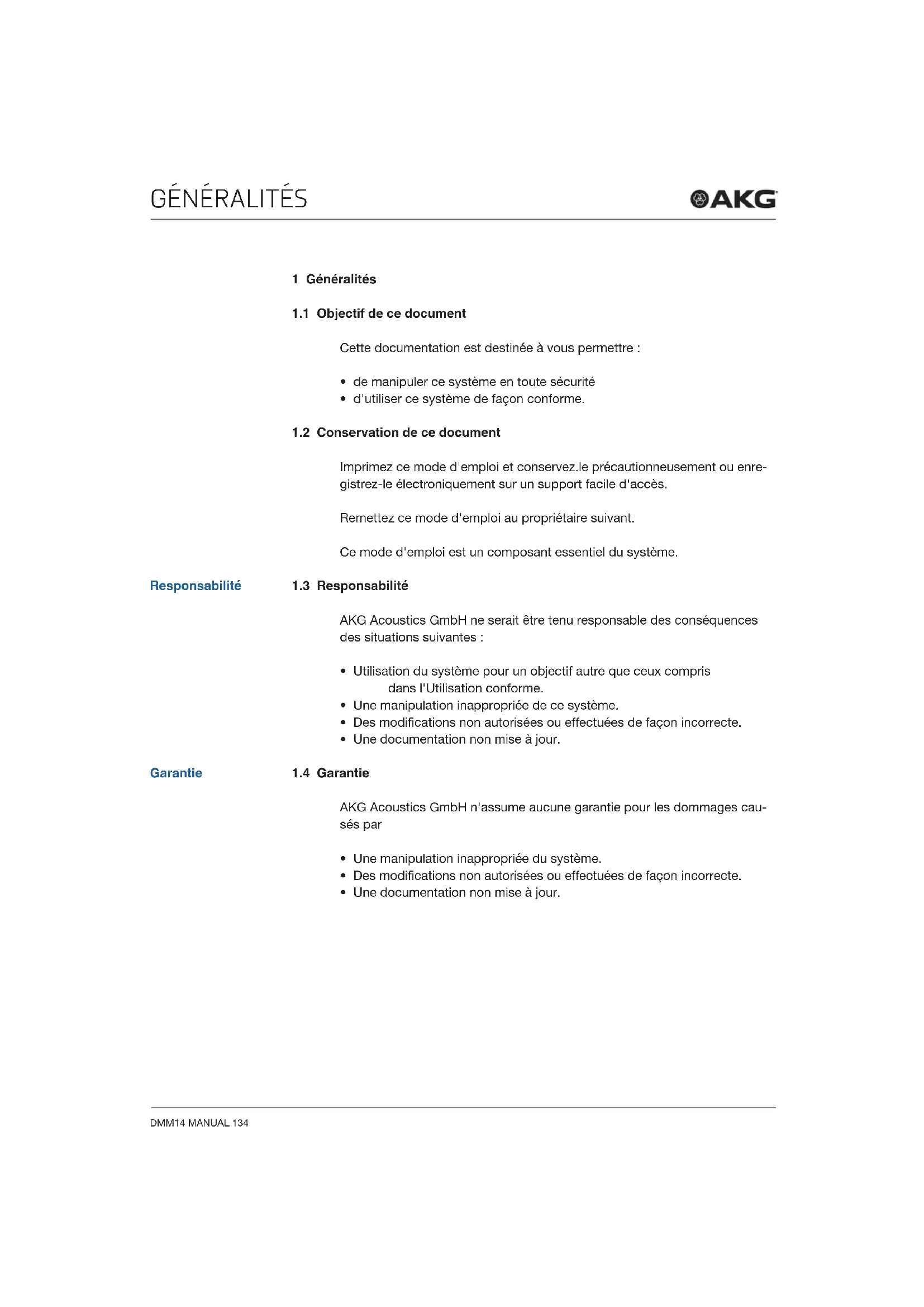 Vous trouverez des accessoires en option à télécharger du site www.akg. com. Votre revendeur vous conseillera avec plaisir. Contenu de l'emballage Accessoires en optionsécUrité et environnement DMM14 MANUAL 136 3 Sécurité et environnement