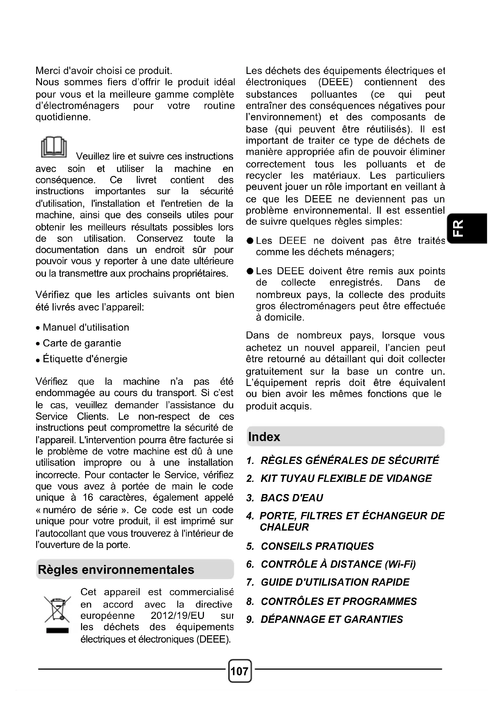 Cette machine est conçue uniquement pour usage domestique à savoir pour sécher le linge domestique et les vêtements. Vérifiez que vous avez bien compris les instructions d’installation et d’utilisation avant de mettre en marche l’appareil. Ne touchez pas la machine si vous avez les mains ou les pieds mouillés ou humides. Ne vous appuyez pas sur la porte lorsque vous chargez la machine et n’utilisez pas la porte pour soulever ou déplacer la machine. ATTENTION La mauvaise utilisation d’un sèche- linge risque de causer un incendie.109