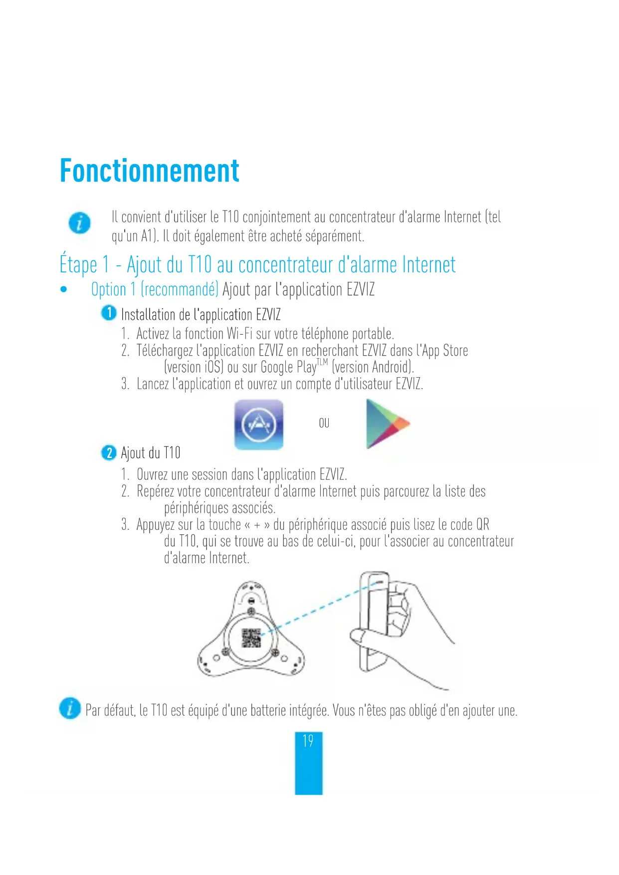 - Si no funciona, se ha agotado la batería. Cambie la batería. Para obtener más información, visite www.ezvizlife.com.19 Fonctionnement Il convient d'utiliser le T10 conjointement au concentrateur d'alarme Internet (tel qu'un A1). Il doit également être acheté séparément. Étape 1 - Ajout du T10 au concentrateur d'alarme Internet