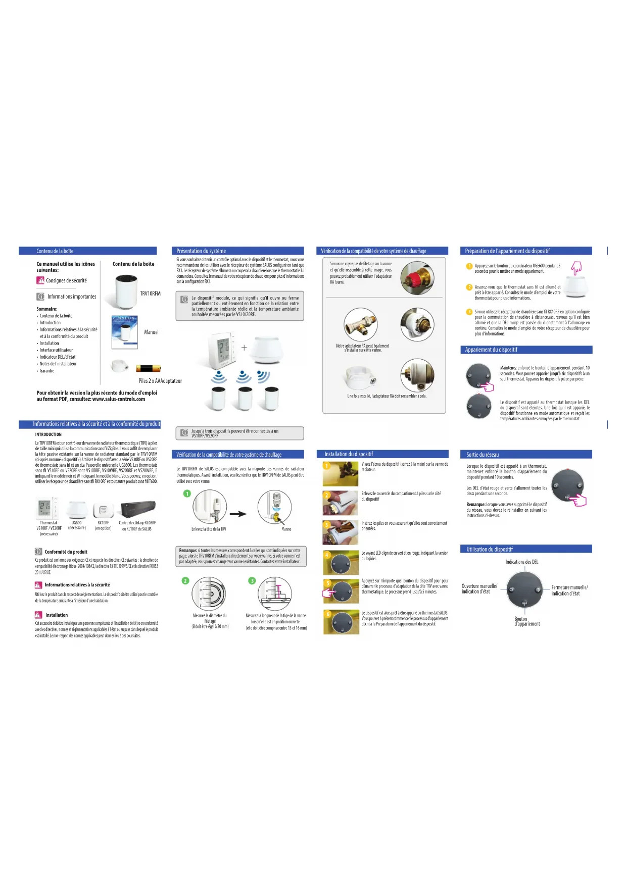 Lorsque le dispositif est apparié à un thermostat, maintenez enfoncé le bouton d’appariement du dispositif pendant 10 secondes.Les DEL d’état rouge et verte s’allument toutes les deux pendant une seconde.Remarque: lorsque vous avez supprimé le dispositif du réseau, vous devez le réinstaller en suivant les instructions ci-dessus. Ce manuel utilise les icônes suivantes: Sommaire:• Contenu de la boîte• Introduction• Informations relatives à la sécurité et à la conformité du produit• Installation• Interface utilisateur• Indicateur DEL/d’état• Notes de l’installateur• Garantie Informations relatives à la sécurité et à la conformité du produit Le TRV10RFM est un contrôleur de vanne de radiateur thermostatique (TRV) à piles de taille mini qui utilise la communication sans l ZigBee. Il vous sut de remplacer la tête passive existante sur la vanne de radiateur standard par le TRV10RFM (ci-après nommé « dispositif »). Utilisez le dispositif avec la série VS10RF ou VS20RF de thermostats sans l et un cLa Passerelle universelle UGE600. Les thermostats sans l VS10RF ou VS20RF sont VS10BRF, VS10WRF, VS20BRF et VS20WRF, B indiquant le modèle noir et W indiquant le modèle blanc. Vous pouvez, en option, utiliser le récepteur de chaudière sans l RX10RF et tout autre produit sans l iT600.Thermostat VS10RF / VS20RF(nécessaire)UG600(nécessaire)Centre de câblage KL08RF ou KL10RF de SALUS Vérication de la compatibilité de votre système de chauage 4Notre adaptateur RA peut également s’installer sur cette vanne.Une fois installé, l’adaptateur RA doit ressembler à cela.Si vous ne voyez pas de letage sur la vanne et qu’elle ressemble à cette image, vous pouvez probablement utiliser l’adaptateur RA fourni. Installation du dispositif Vissez l’écrou du dispositif (serrez à la main) sur la vanne de radiateur.Appuyez sur n’importe quel bouton du dispositif pour pour démarrer le processus d’adaptation de la tête TRV avec vanne thermostatique. Le processus prend jusqu’à 5 minutes.Le dispositif est alors prêt à être apparié au thermostat SALUS.Vous pouvez à présent commencer le processus d’appariement décrit à la Préparation de l’appariement du dispositif.