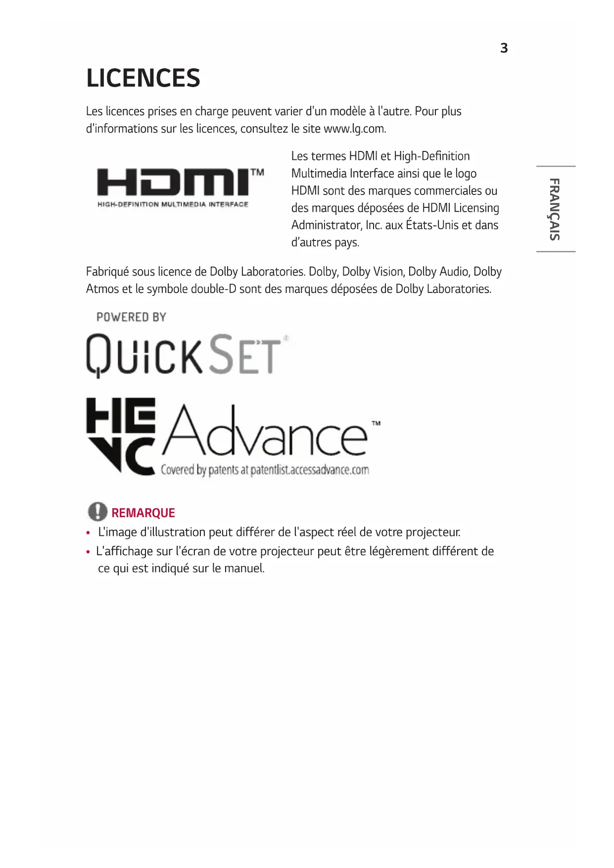 SPÉCIFICATIONS 45 SYMBOLES 51 DÉPANNAGE 523 FRANÇAIS LICENCES Les licences prises en charge peuvent varier d'un modèle à l'autre. Pour plus d'informations sur les licences, consultez le site www.lg.com. Les termes HDMI et High-Denition Multimedia Interface ainsi que le logo HDMI sont des marques commerciales ou des marques déposées de HDMI Licensing Administrator, Inc. aux États-Unis et dans d’autres pays. Fabriqué sous licence de Dolby Laboratories. Dolby, Dolby Vision, Dolby Audio, Dolby Atmos et le symbole double-D sont des marques déposées de Dolby Laboratories. REMARQUE