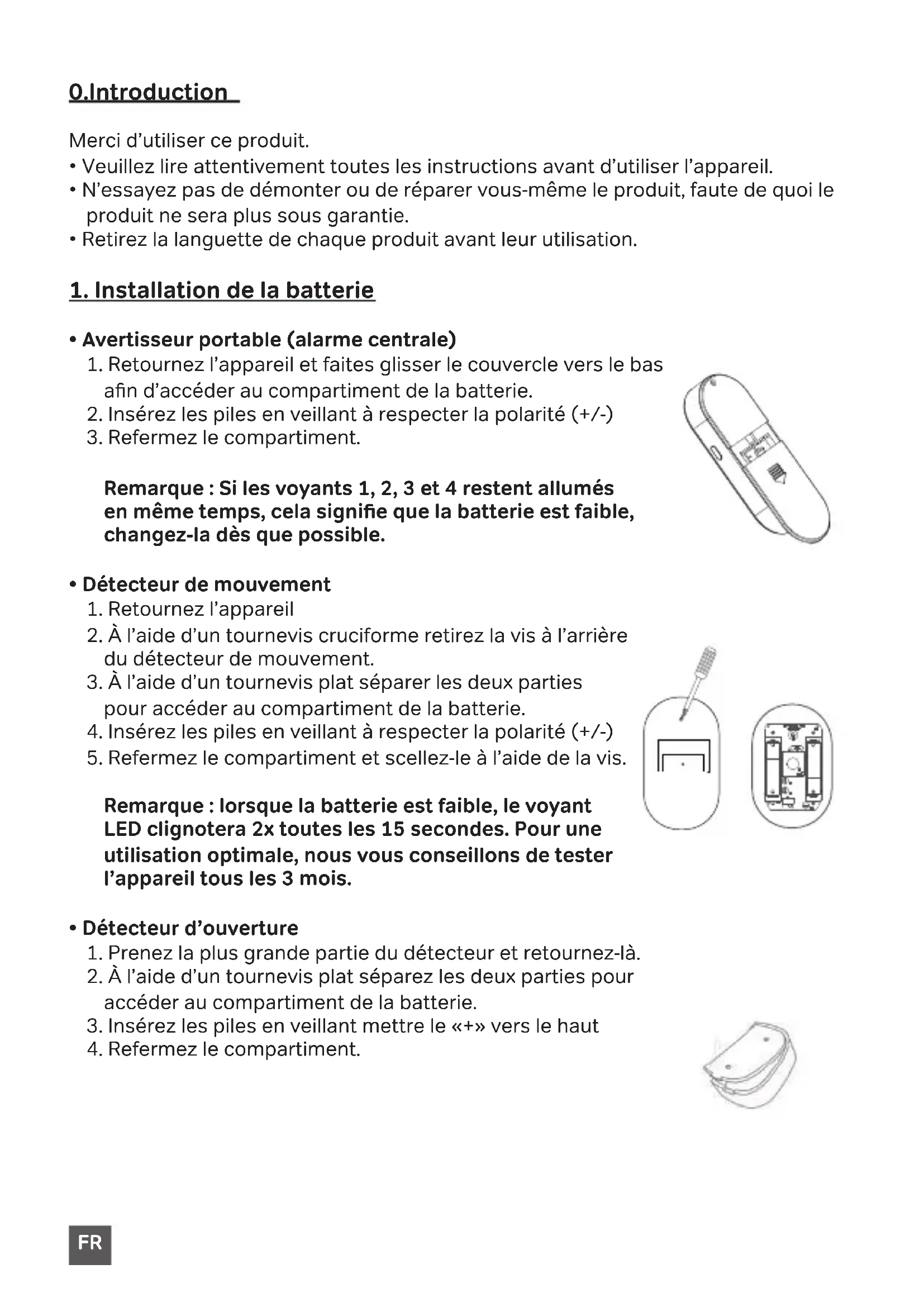 Remarque : lorsque la batterie est faible, le voyant LED clignotera 2x toutes les 15 secondes. Pour une utilisation optimale, nous vous conseillons de tester l’appareil tous les 3 mois.