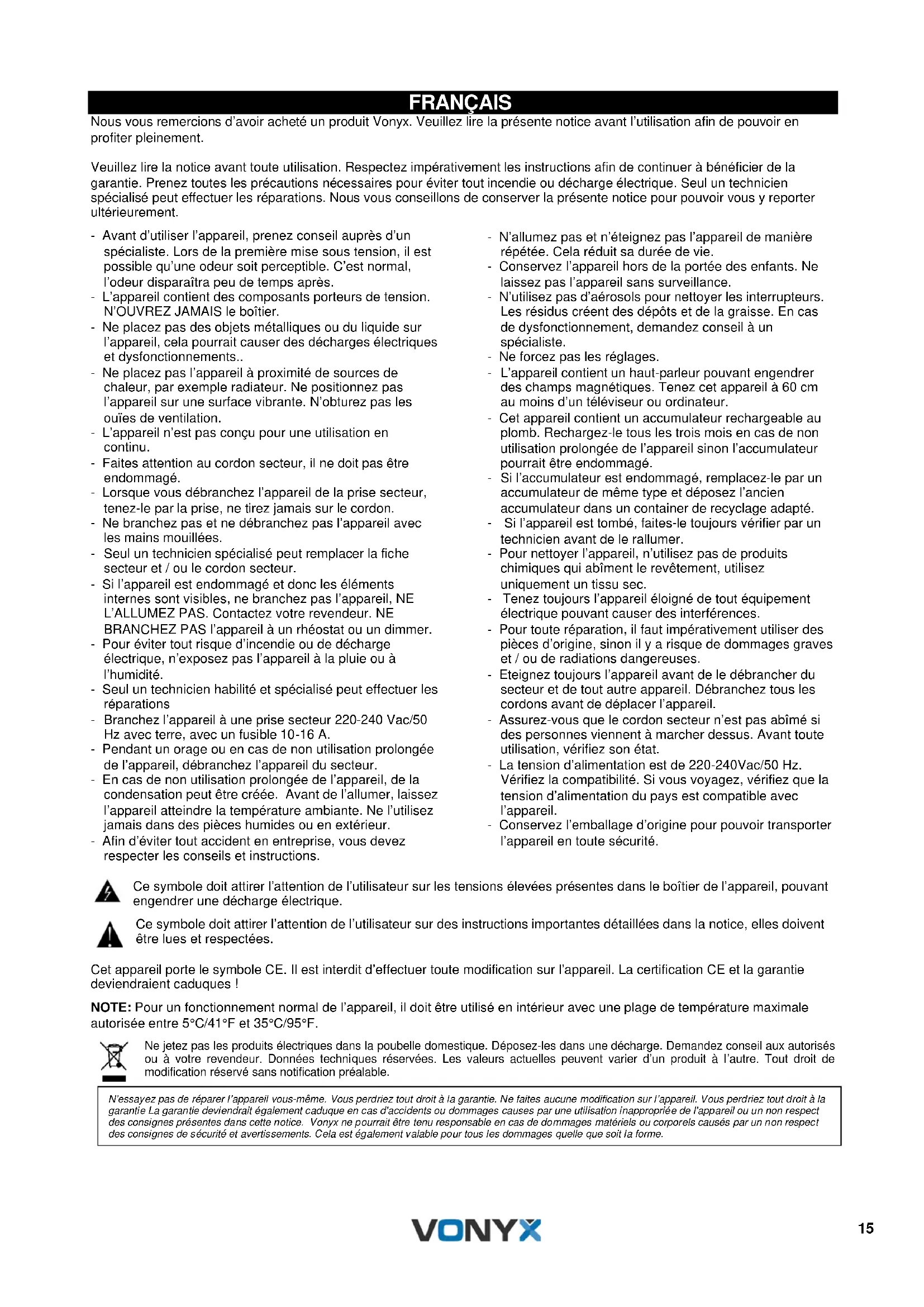 Presione brevemente el botón para seleccionar la canción anterior, presione largo para disminuir el volumen.15 FRANÇAIS Nous vous remercions d’avoir acheté un produit Vonyx. Veuillez lire la présente notice avant l’utilisation afin de pouvoir en profiter pleinement. Veuillez lire la notice avant toute utilisation. Respectez impérativement les instructions afin de continuer à bénéficier de la garantie. Prenez toutes les précautions nécessaires pour éviter tout incendie ou décharge électrique. Seul un technicien spécialisé peut effectuer les réparations. Nous vous conseillons de conserver la présente notice pour pouvoir vous y reporter ultérieurement. - Avant d’utiliser l’appareil, prenez conseil auprès d’un spécialiste. Lors de la première mise sous tension, il est possible qu’une odeur soit perceptible. C’est normal, l’odeur disparaîtra peu de temps après. - L’appareil contient des composants porteurs de tension. N’OUVREZ JAMAIS le boîtier. - Ne placez pas des objets métalliques ou du liquide sur l’appareil, cela pourrait causer des décharges électriques et dysfonctionnements.. - Ne placez pas l’appareil à proximité de sources de chaleur, par exemple radiateur. Ne positionnez pas l’appareil sur une surface vibrante. N’obturez pas les ouïes de ventilation. - L’appareil n’est pas conçu pour une utilisation en continu. - Faites attention au cordon secteur, il ne doit pas être endommagé. - Lorsque vous débranchez l’appareil de la prise secteur, tenez-le par la prise, ne tirez jamais sur le cordon. - Ne branchez pas et ne débranchez pas l’appareil avec les mains mouillées. - Seul un technicien spécialisé peut remplacer la fiche secteur et / ou le cordon secteur. - Si l’appareil est endommagé et donc les éléments internes sont visibles, ne branchez pas l’appareil, NE L’ALLUMEZ PAS. Contactez votre revendeur. NE BRANCHEZ PAS l’appareil à un rhéostat ou un dimmer. - Pour éviter tout risque d’incendie ou de décharge électrique, n’exposez pas l’appareil à la pluie ou à l’humidité. - Seul un technicien habilité et spécialisé peut effectuer les réparations - Branchez l’appareil à une prise secteur 220-240 Vac/50 Hz avec terre, avec un fusible 10-16 A. - Pendant un orage ou en cas de non utilisation prolongée de l’appareil, débranchez l’appareil du secteur. - En cas de non utilisation prolongée de l’appareil, de la condensation peut être créée. Avant de l’allumer, laissez l’appareil atteindre la température ambiante. Ne l’utilisez jamais dans des pièces humides ou en extérieur. - Afin d’éviter tout accident en entreprise, vous devez respecter les conseils et instructions. - N’allumez pas et n’éteignez pas l’appareil de manière répétée. Cela réduit sa durée de vie. - Conservez l’appareil hors de la portée des enfants. Ne laissez pas l’appareil sans surveillance. - N’utilisez pas d’aérosols pour nettoyer les interrupteurs. Les résidus créent des dépôts et de la graisse. En cas de dysfonctionnement, demandez conseil à un spécialiste. - Ne forcez pas les réglages. - L’appareil contient un haut-parleur pouvant engendrer des champs magnétiques. Tenez cet appareil à 60 cm au moins d’un téléviseur ou ordinateur. - Cet appareil contient un accumulateur rechargeable au plomb. Rechargez-le tous les trois mois en cas de non utilisation prolongée de l’appareil sinon l’accumulateur pourrait être endommagé. - Si l’accumulateur est endommagé, remplacez-le par un accumulateur de même type et déposez l’ancien accumulateur dans un container de recyclage adapté. - Si l’appareil est tombé, faites-le toujours vérifier par un technicien avant de le rallumer. - Pour nettoyer l’appareil, n’utilisez pas de produits chimiques qui abîment le revêtement, utilisez uniquement un tissu sec. - Tenez toujours l’appareil éloigné de tout équipement électrique pouvant causer des interférences. - Pour toute réparation, il faut impérativement utiliser des pièces d’origine, sinon il y a risque de dommages graves et / ou de radiations dangereuses. - Eteignez toujours l’appareil avant de le débrancher du secteur et de tout autre appareil. Débranchez tous les cordons avant de déplacer l’appareil. - Assurez-vous que le cordon secteur n’est pas abîmé si des personnes viennent à marcher dessus. Avant toute utilisation, vérifiez son état. - La tension d’alimentation est de 220-240Vac/50 Hz. Vérifiez la compatibilité. Si vous voyagez, vérifiez que la tension d’alimentation du pays est compatible avec l’appareil. - Conservez l’emballage d’origine pour pouvoir transporter l’appareil en toute sécurité. Ce symbole doit attirer l’attention de l’utilisateur sur les tensions élevées présentes dans le boîtier de l’appareil, pouvant engendrer une décharge électrique. Ce symbole doit attirer l’attention de l’utilisateur sur des instructions importantes détaillées dans la notice, elles doivent être lues et respectées. Cet appareil porte le symbole CE. Il est interdit d’effectuer toute modification sur l’appareil. La certification CE et la garantie deviendraient caduques ! NOTE: Pour un fonctionnement normal de l’appareil, il doit être utilisé en intérieur avec une plage de température maximale autorisée entre 5°C/41°F et 35°C/95°F. Ne jetez pas les produits électriques dans la poubelle domestique. Déposez-les dans une décharge. Demandez conseil aux autorisés ou à votre revendeur. Données techniques réservées. Les valeurs actuelles peuvent varier d’un produit à l’autre. Tout droit de modification réservé sans notification préalable.