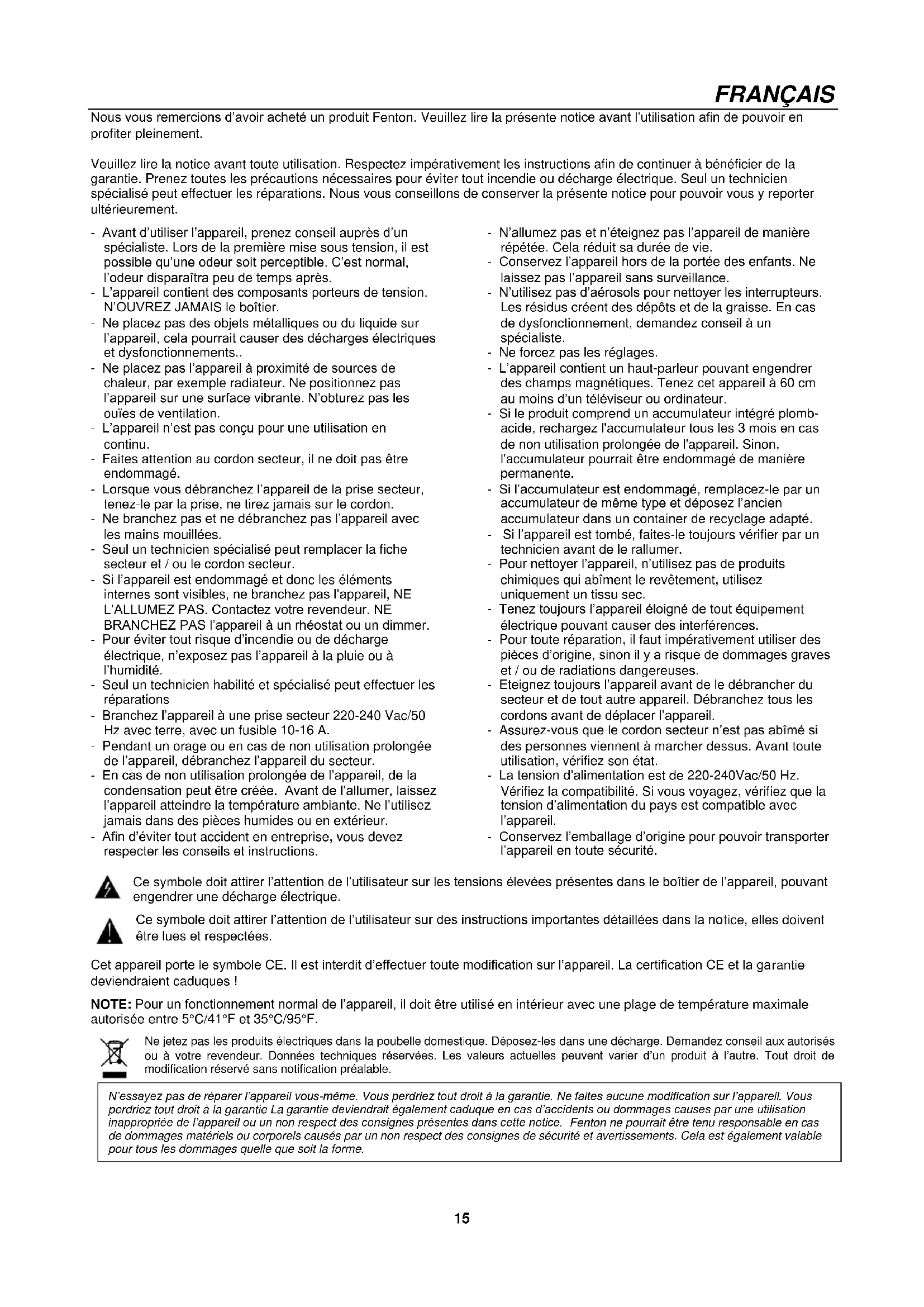 Si se requiere contraseña, puede ingresar "0000". Atención: La distancia BT es de aprox. 10 metros sin barrera.15 FRANÇAIS Nous vous remercions d’avoir acheté un produit Fenton. Veuillez lire la présente notice avant l’utilisation afin de pouvoir en profiter pleinement. Veuillez lire la notice avant toute utilisation. Respectez impérativement les instructions afin de continuer à bénéficier de la garantie. Prenez toutes les précautions nécessaires pour éviter tout incendie ou décharge électrique. Seul un technicien spécialisé peut effectuer les réparations. Nous vous conseillons de conserver la présente notice pour pouvoir vous y reporter ultérieurement. - Avant d’utiliser l’appareil, prenez conseil auprès d’un spécialiste. Lors de la première mise sous tension, il est possible qu’une odeur soit perceptible. C’est normal, l’odeur disparaîtra peu de temps après. - L’appareil contient des composants porteurs de tension. N’OUVREZ JAMAIS le boîtier. - Ne placez pas des objets métalliques ou du liquide sur l’appareil, cela pourrait causer des décharges électriques et dysfonctionnements.. - Ne placez pas l’appareil à proximité de sources de chaleur, par exemple radiateur. Ne positionnez pas l’appareil sur une surface vibrante. N’obturez pas les ouïes de ventilation. - L’appareil n’est pas conçu pour une utilisation en continu. - Faites attention au cordon secteur, il ne doit pas être endommagé. - Lorsque vous débranchez l’appareil de la prise secteur, tenez-le par la prise, ne tirez jamais sur le cordon. - Ne branchez pas et ne débranchez pas l’appareil avec les mains mouillées. - Seul un technicien spécialisé peut remplacer la fiche secteur et / ou le cordon secteur. - Si l’appareil est endommagé et donc les éléments internes sont visibles, ne branchez pas l’appareil, NE L’ALLUMEZ PAS. Contactez votre revendeur. NE BRANCHEZ PAS l’appareil à un rhéostat ou un dimmer. - Pour éviter tout risque d’incendie ou de décharge électrique, n’exposez pas l’appareil à la pluie ou à l’humidité. - Seul un technicien habilité et spécialisé peut effectuer les réparations - Branchez l’appareil à une prise secteur 220-240 Vac/50 Hz avec terre, avec un fusible 10-16 A. - Pendant un orage ou en cas de non utilisation prolongée de l’appareil, débranchez l’appareil du secteur. - En cas de non utilisation prolongée de l’appareil, de la condensation peut être créée. Avant de l’allumer, laissez l’appareil atteindre la température ambiante. Ne l’utilisez jamais dans des pièces humides ou en extérieur. - Afin d’éviter tout accident en entreprise, vous devez respecter les conseils et instructions. - N’allumez pas et n’éteignez pas l’appareil de manière répétée. Cela réduit sa durée de vie. - Conservez l’appareil hors de la portée des enfants. Ne laissez pas l’appareil sans surveillance. - N’utilisez pas d’aérosols pour nettoyer les interrupteurs. Les résidus créent des dépôts et de la graisse. En cas de dysfonctionnement, demandez conseil à un spécialiste. - Ne forcez pas les réglages. - L’appareil contient un haut-parleur pouvant engendrer des champs magnétiques. Tenez cet appareil à 60 cm au moins d’un téléviseur ou ordinateur. - Si le produit comprend un accumulateur intégré plomb- acide, rechargez l'accumulateur tous les 3 mois en cas de non utilisation prolongée de l'appareil. Sinon, l'accumulateur pourrait être endommagé de manière permanente. - Si l’accumulateur est endommagé, remplacez-le par un accumulateur de même type et déposez l’ancien accumulateur dans un container de recyclage adapté. - Si l’appareil est tombé, faites-le toujours vérifier par un technicien avant de le rallumer. - Pour nettoyer l’appareil, n’utilisez pas de produits chimiques qui abîment le revêtement, utilisez uniquement un tissu sec. - Tenez toujours l’appareil éloigné de tout équipement électrique pouvant causer des interférences. - Pour toute réparation, il faut impérativement utiliser des pièces d’origine, sinon il y a risque de dommages graves et / ou de radiations dangereuses. - Eteignez toujours l’appareil avant de le débrancher du secteur et de tout autre appareil. Débranchez tous les cordons avant de déplacer l’appareil. - Assurez-vous que le cordon secteur n’est pas abîmé si des personnes viennent à marcher dessus. Avant toute utilisation, vérifiez son état. - La tension d’alimentation est de 220-240Vac/50 Hz. Vérifiez la compatibilité. Si vous voyagez, vérifiez que la tension d’alimentation du pays est compatible avec l’appareil. - Conservez l’emballage d’origine pour pouvoir transporter l’appareil en toute sécurité. Ce symbole doit attirer l’attention de l’utilisateur sur les tensions élevées présentes dans le boîtier de l’appareil, pouvant engendrer une décharge électrique. Ce symbole doit attirer l’attention de l’utilisateur sur des instructions importantes détaillées dans la notice, elles doivent être lues et respectées. Cet appareil porte le symbole CE. Il est interdit d’effectuer toute modification sur l’appareil. La certification CE et la garantie deviendraient caduques ! NOTE: Pour un fonctionnement normal de l’appareil, il doit être utilisé en intérieur avec une plage de température maximale autorisée entre 5°C/41°F et 35°C/95°F. Ne jetez pas les produits électriques dans la poubelle domestique. Déposez-les dans une décharge. Demandez conseil aux autorisés ou à votre revendeur. Données techniques réservées. Les valeurs actuelles peuvent varier d’un produit à l’autre. Tout droit de modification réservé sans notification préalable.