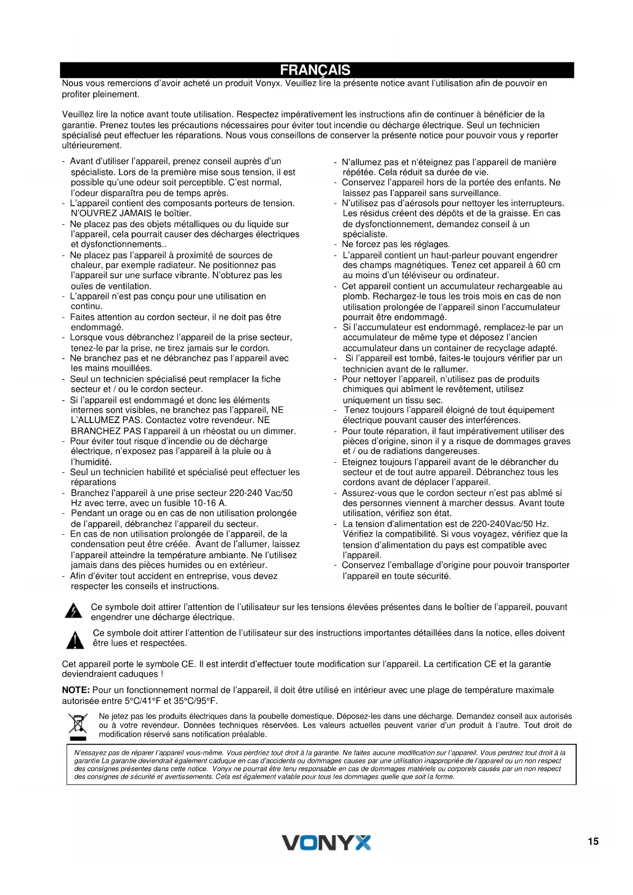 Conector de 6,3mm para conectar un auricular.15 FRANÇAIS Nous vous remercions d’avoir acheté un produit Vonyx. Veuillez lire la présente notice avant l’utilisation afin de pouvoir en profiter pleinement. Veuillez lire la notice avant toute utilisation. Respectez impérativement les instructions afin de continuer à bénéficier de la garantie. Prenez toutes les précautions nécessaires pour éviter tout incendie ou décharge électrique. Seul un technicien spécialisé peut effectuer les réparations. Nous vous conseillons de conserver la présente notice pour pouvoir vous y reporter ultérieurement. - Avant d’utiliser l’appareil, prenez conseil auprès d’un spécialiste. Lors de la première mise sous tension, il est possible qu’une odeur soit perceptible. C’est normal, l’odeur disparaîtra peu de temps après. - L’appareil contient des composants porteurs de tension. N’OUVREZ JAMAIS le boîtier. - Ne placez pas des objets métalliques ou du liquide sur l’appareil, cela pourrait causer des décharges électriques et dysfonctionnements.. - Ne placez pas l’appareil à proximité de sources de chaleur, par exemple radiateur. Ne positionnez pas l’appareil sur une surface vibrante. N’obturez pas les ouïes de ventilation. - L’appareil n’est pas conçu pour une utilisation en continu. - Faites attention au cordon secteur, il ne doit pas être endommagé. - Lorsque vous débranchez l’appareil de la prise secteur, tenez-le par la prise, ne tirez jamais sur le cordon. - Ne branchez pas et ne débranchez pas l’appareil avec les mains mouillées. - Seul un technicien spécialisé peut remplacer la fiche secteur et / ou le cordon secteur. - Si l’appareil est endommagé et donc les éléments internes sont visibles, ne branchez pas l’appareil, NE L’ALLUMEZ PAS. Contactez votre revendeur. NE BRANCHEZ PAS l’appareil à un rhéostat ou un dimmer. - Pour éviter tout risque d’incendie ou de décharge électrique, n’exposez pas l’appareil à la pluie ou à l’humidité. - Seul un technicien habilité et spécialisé peut effectuer les réparations - Branchez l’appareil à une prise secteur 220-240 Vac/50 Hz avec terre, avec un fusible 10-16 A. - Pendant un orage ou en cas de non utilisation prolongée de l’appareil, débranchez l’appareil du secteur. - En cas de non utilisation prolongée de l’appareil, de la condensation peut être créée. Avant de l’allumer, laissez l’appareil atteindre la température ambiante. Ne l’utilisez jamais dans des pièces humides ou en extérieur. - Afin d’éviter tout accident en entreprise, vous devez respecter les conseils et instructions. - N’allumez pas et n’éteignez pas l’appareil de manière répétée. Cela réduit sa durée de vie. - Conservez l’appareil hors de la portée des enfants. Ne laissez pas l’appareil sans surveillance. - N’utilisez pas d’aérosols pour nettoyer les interrupteurs. Les résidus créent des dépôts et de la graisse. En cas de dysfonctionnement, demandez conseil à un spécialiste. - Ne forcez pas les réglages. - L’appareil contient un haut-parleur pouvant engendrer des champs magnétiques. Tenez cet appareil à 60 cm au moins d’un téléviseur ou ordinateur. - Cet appareil contient un accumulateur rechargeable au plomb. Rechargez-le tous les trois mois en cas de non utilisation prolongée de l’appareil sinon l’accumulateur pourrait être endommagé. - Si l’accumulateur est endommagé, remplacez-le par un accumulateur de même type et déposez l’ancien accumulateur dans un container de recyclage adapté. - Si l’appareil est tombé, faites-le toujours vérifier par un technicien avant de le rallumer. - Pour nettoyer l’appareil, n’utilisez pas de produits chimiques qui abîment le revêtement, utilisez uniquement un tissu sec. - Tenez toujours l’appareil éloigné de tout équipement électrique pouvant causer des interférences. - Pour toute réparation, il faut impérativement utiliser des pièces d’origine, sinon il y a risque de dommages graves et / ou de radiations dangereuses. - Eteignez toujours l’appareil avant de le débrancher du secteur et de tout autre appareil. Débranchez tous les cordons avant de déplacer l’appareil. - Assurez-vous que le cordon secteur n’est pas abîmé si des personnes viennent à marcher dessus. Avant toute utilisation, vérifiez son état. - La tension d’alimentation est de 220-240Vac/50 Hz. Vérifiez la compatibilité. Si vous voyagez, vérifiez que la tension d’alimentation du pays est compatible avec l’appareil. - Conservez l’emballage d’origine pour pouvoir transporter l’appareil en toute sécurité. Ce symbole doit attirer l’attention de l’utilisateur sur les tensions élevées présentes dans le boîtier de l’appareil, pouvant engendrer une décharge électrique. Ce symbole doit attirer l’attention de l’utilisateur sur des instructions importantes détaillées dans la notice, elles doivent être lues et respectées. Cet appareil porte le symbole CE. Il est interdit d’effectuer toute modification sur l’appareil. La certification CE et la garantie deviendraient caduques ! NOTE: Pour un fonctionnement normal de l’appareil, il doit être utilisé en intérieur avec une plage de température maximale autorisée entre 5°C/41°F et 35°C/95°F. Ne jetez pas les produits électriques dans la poubelle domestique. Déposez-les dans une décharge. Demandez conseil aux autorisés ou à votre revendeur. Données techniques réservées. Les valeurs actuelles peuvent varier d’un produit à l’autre. Tout droit de modification réservé sans notification préalable.