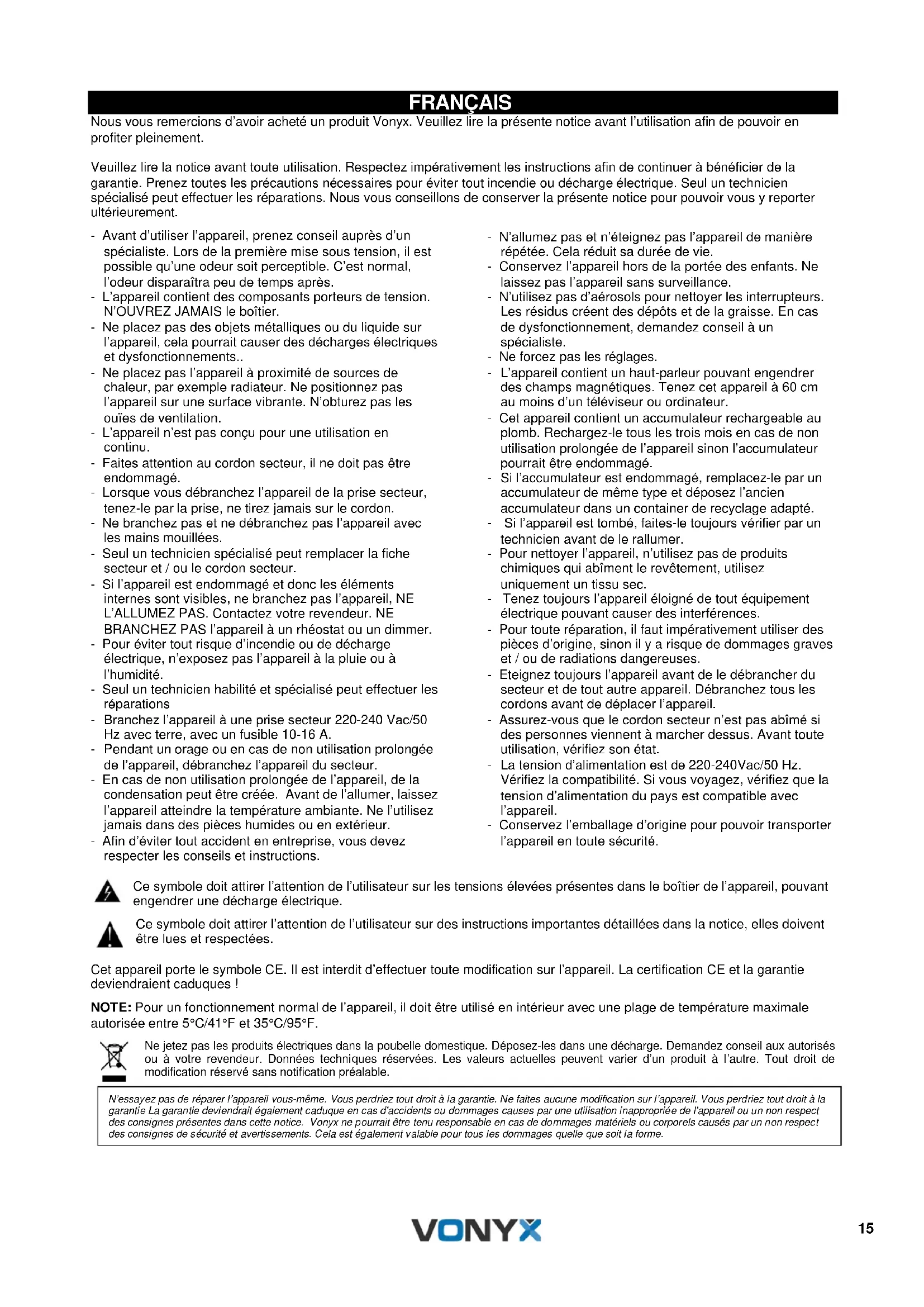Conector de 6,3mm para conectar un auricular.15 FRANÇAIS Nous vous remercions d’avoir acheté un produit Vonyx. Veuillez lire la présente notice avant l’utilisation afin de pouvoir en profiter pleinement. Veuillez lire la notice avant toute utilisation. Respectez impérativement les instructions afin de continuer à bénéficier de la garantie. Prenez toutes les précautions nécessaires pour éviter tout incendie ou décharge électrique. Seul un technicien spécialisé peut effectuer les réparations. Nous vous conseillons de conserver la présente notice pour pouvoir vous y reporter ultérieurement. - Avant d’utiliser l’appareil, prenez conseil auprès d’un spécialiste. Lors de la première mise sous tension, il est possible qu’une odeur soit perceptible. C’est normal, l’odeur disparaîtra peu de temps après. - L’appareil contient des composants porteurs de tension. N’OUVREZ JAMAIS le boîtier. - Ne placez pas des objets métalliques ou du liquide sur l’appareil, cela pourrait causer des décharges électriques et dysfonctionnements.. - Ne placez pas l’appareil à proximité de sources de chaleur, par exemple radiateur. Ne positionnez pas l’appareil sur une surface vibrante. N’obturez pas les ouïes de ventilation. - L’appareil n’est pas conçu pour une utilisation en continu. - Faites attention au cordon secteur, il ne doit pas être endommagé. - Lorsque vous débranchez l’appareil de la prise secteur, tenez-le par la prise, ne tirez jamais sur le cordon. - Ne branchez pas et ne débranchez pas l’appareil avec les mains mouillées. - Seul un technicien spécialisé peut remplacer la fiche secteur et / ou le cordon secteur. - Si l’appareil est endommagé et donc les éléments internes sont visibles, ne branchez pas l’appareil, NE L’ALLUMEZ PAS. Contactez votre revendeur. NE BRANCHEZ PAS l’appareil à un rhéostat ou un dimmer. - Pour éviter tout risque d’incendie ou de décharge électrique, n’exposez pas l’appareil à la pluie ou à l’humidité. - Seul un technicien habilité et spécialisé peut effectuer les réparations - Branchez l’appareil à une prise secteur 220-240 Vac/50 Hz avec terre, avec un fusible 10-16 A. - Pendant un orage ou en cas de non utilisation prolongée de l’appareil, débranchez l’appareil du secteur. - En cas de non utilisation prolongée de l’appareil, de la condensation peut être créée. Avant de l’allumer, laissez l’appareil atteindre la température ambiante. Ne l’utilisez jamais dans des pièces humides ou en extérieur. - Afin d’éviter tout accident en entreprise, vous devez respecter les conseils et instructions. - N’allumez pas et n’éteignez pas l’appareil de manière répétée. Cela réduit sa durée de vie. - Conservez l’appareil hors de la portée des enfants. Ne laissez pas l’appareil sans surveillance. - N’utilisez pas d’aérosols pour nettoyer les interrupteurs. Les résidus créent des dépôts et de la graisse. En cas de dysfonctionnement, demandez conseil à un spécialiste. - Ne forcez pas les réglages. - L’appareil contient un haut-parleur pouvant engendrer des champs magnétiques. Tenez cet appareil à 60 cm au moins d’un téléviseur ou ordinateur. - Cet appareil contient un accumulateur rechargeable au plomb. Rechargez-le tous les trois mois en cas de non utilisation prolongée de l’appareil sinon l’accumulateur pourrait être endommagé. - Si l’accumulateur est endommagé, remplacez-le par un accumulateur de même type et déposez l’ancien accumulateur dans un container de recyclage adapté. - Si l’appareil est tombé, faites-le toujours vérifier par un technicien avant de le rallumer. - Pour nettoyer l’appareil, n’utilisez pas de produits chimiques qui abîment le revêtement, utilisez uniquement un tissu sec. - Tenez toujours l’appareil éloigné de tout équipement électrique pouvant causer des interférences. - Pour toute réparation, il faut impérativement utiliser des pièces d’origine, sinon il y a risque de dommages graves et / ou de radiations dangereuses. - Eteignez toujours l’appareil avant de le débrancher du secteur et de tout autre appareil. Débranchez tous les cordons avant de déplacer l’appareil. - Assurez-vous que le cordon secteur n’est pas abîmé si des personnes viennent à marcher dessus. Avant toute utilisation, vérifiez son état. - La tension d’alimentation est de 220-240Vac/50 Hz. Vérifiez la compatibilité. Si vous voyagez, vérifiez que la tension d’alimentation du pays est compatible avec l’appareil. - Conservez l’emballage d’origine pour pouvoir transporter l’appareil en toute sécurité. Ce symbole doit attirer l’attention de l’utilisateur sur les tensions élevées présentes dans le boîtier de l’appareil, pouvant engendrer une décharge électrique. Ce symbole doit attirer l’attention de l’utilisateur sur des instructions importantes détaillées dans la notice, elles doivent être lues et respectées. Cet appareil porte le symbole CE. Il est interdit d’effectuer toute modification sur l’appareil. La certification CE et la garantie deviendraient caduques ! NOTE: Pour un fonctionnement normal de l’appareil, il doit être utilisé en intérieur avec une plage de température maximale autorisée entre 5°C/41°F et 35°C/95°F. Ne jetez pas les produits électriques dans la poubelle domestique. Déposez-les dans une décharge. Demandez conseil aux autorisés ou à votre revendeur. Données techniques réservées. Les valeurs actuelles peuvent varier d’un produit à l’autre. Tout droit de modification réservé sans notification préalable.