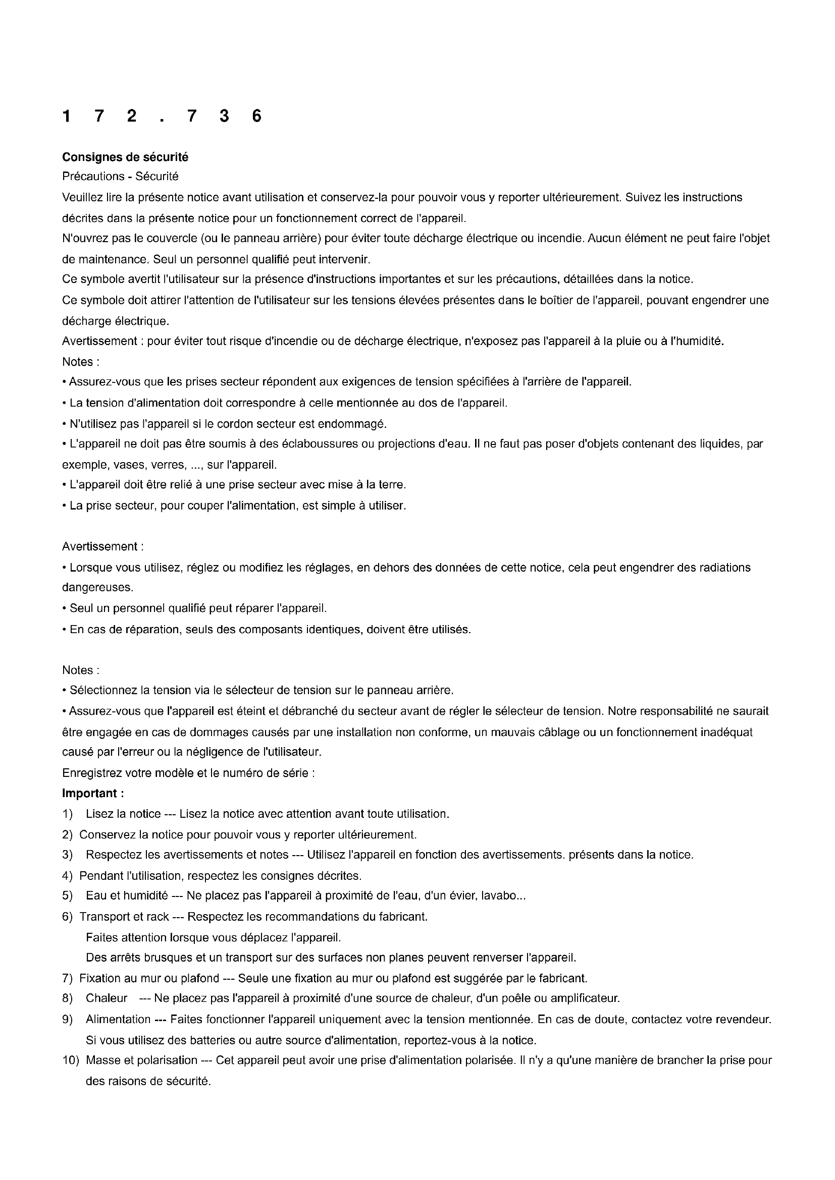 11) Protection cordon secteur --- Le cordon secteur ne doit pas être torsadé ou écrabouillé. 12) Nettoyage --- Nettoyez l'appareil avec un tissu doux, évitez que de l'eau n'entre dans l'appareil. 13) Pour les appareils avec cordon AC, vérifiez les caractéristiques de la fiche d'alimentation, et toutes les parties métalliques avant utilisation avec un ohm-mètre : la résistance doit être de plus de 100k 14) Arrêt --- Débranchez le cordon secteur en cas de non utilisation prolongée de l'appareil. 15) Objets - Aucun objet ni liquide ne doit tomber dans l'appareil via les ouïes de ventilation. 16) Service technique—Seul un technicien qualifié peut réparer l'appareil si: