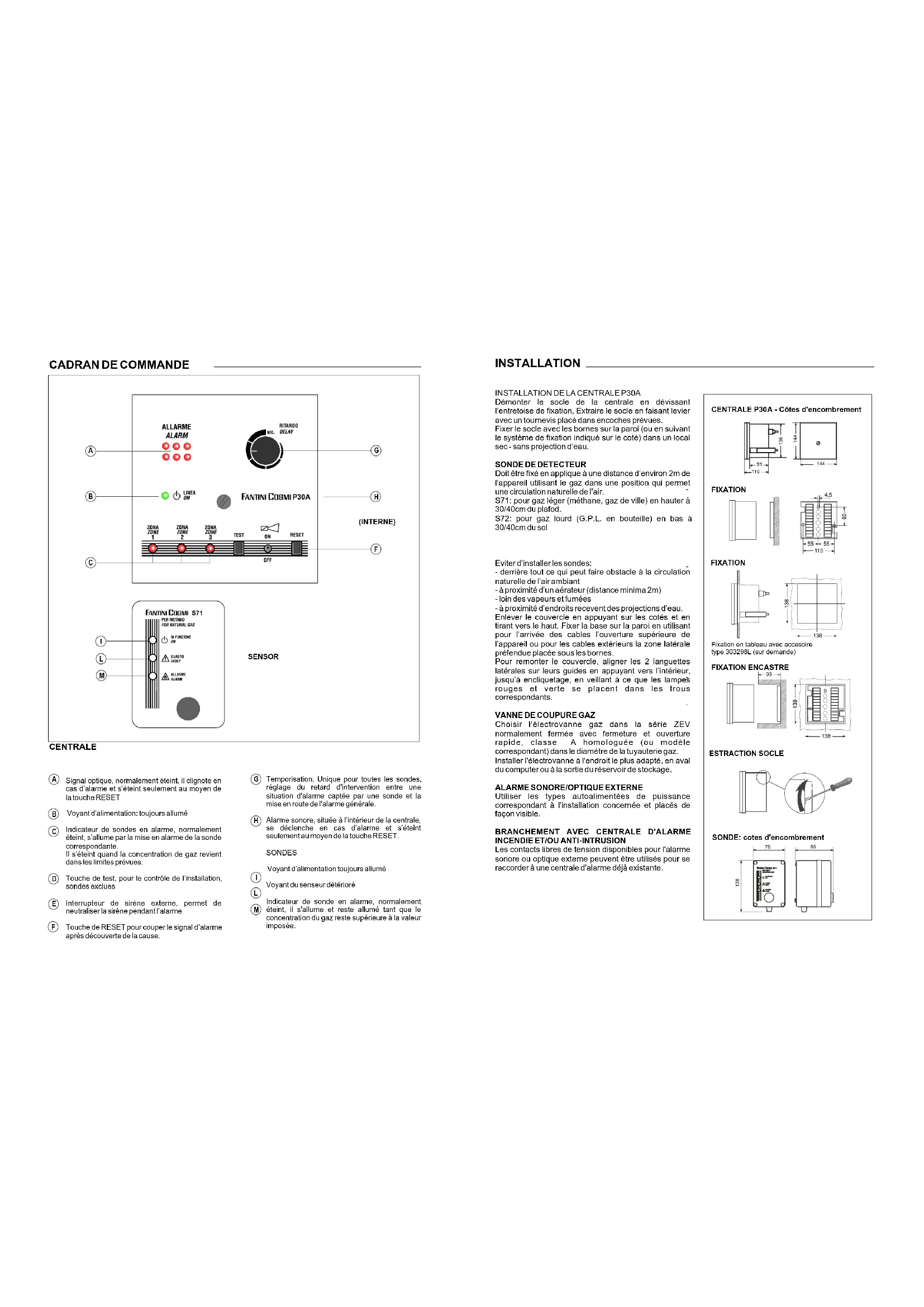 Signal optique, normalement éteint, il clignote en cas d’alarme et s’éteint seulement au moyen de la touche RESET Voyant d’alimentation: toujours alluméIndicateur de sondes en alarme, normalement éteint, s’allume par la mise en alarme de la sonde correspondante.Il s’éteint quand la concentration de gaz revient dans les limites prévues.Touche de test, pour le contrôle de l’installation, sondes excluesInterrupteur de sirène externe, permet de neutraliser la sirène pendant l’alarmeTouche de RESET pour couper le signal d’alarme après découverte de la cause. INSTALLATION CENTRALE P30A - Côtes d'encombrementFIXATIONFIXATIONFIXATION ENCASTRESONDE: cotes d'encombrement
