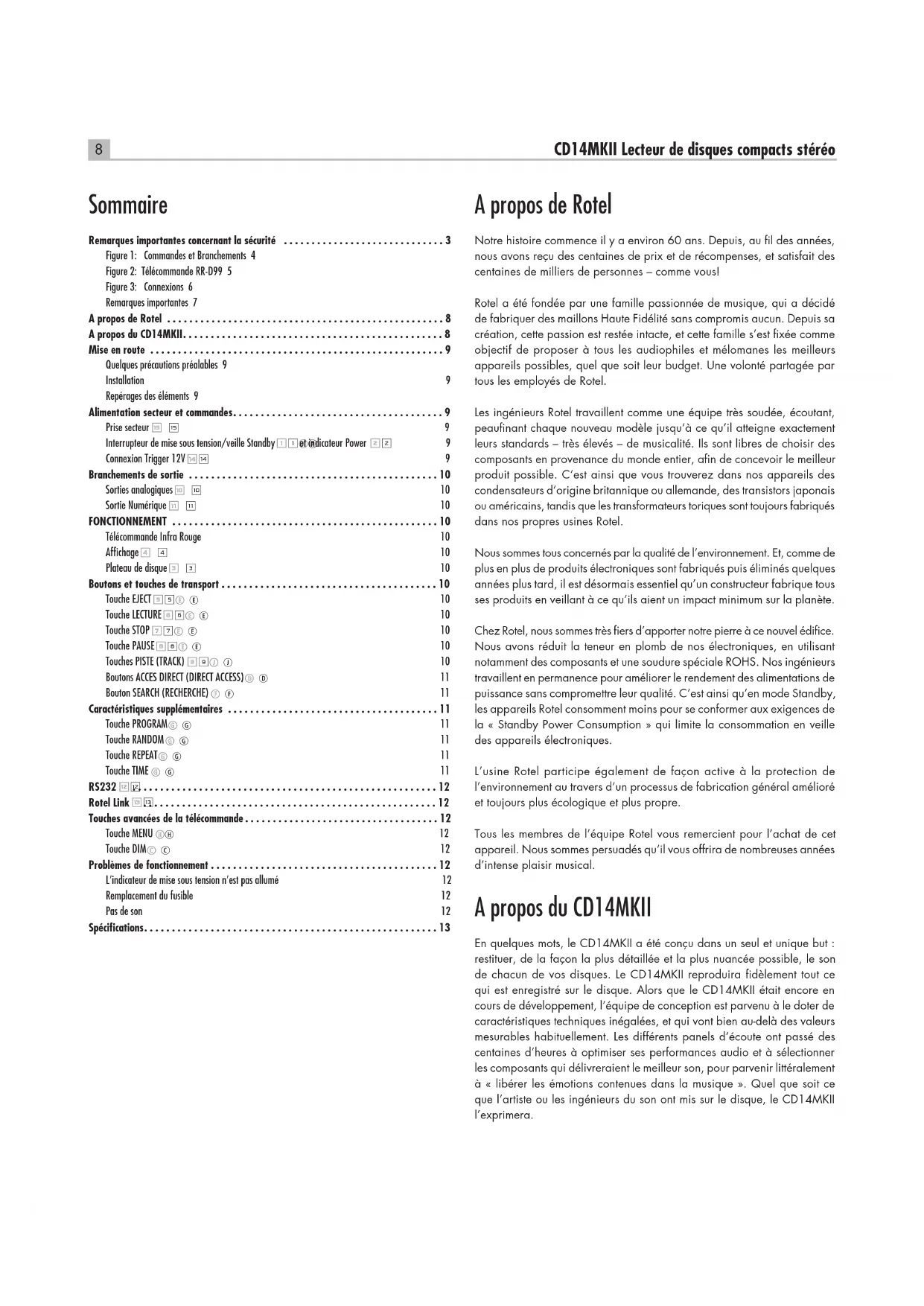 Problèmes de fonctionnement .........................................12 L’indicateur de mise sous tension n’est pas allumé 12 Remplacement du fusible 12 Pas de son 12 Spécications .....................................................13 A propos de Rotel Notre histoire commence il y a environ 60 ans. Depuis, au l des années, nous avons reçu des centaines de prix et de récompenses, et satisfait des centaines de milliers de personnes – comme vous! Rotel a été fondée par une famille passionnée de musique, qui a décidé de fabriquer des maillons Haute Fidélité sans compromis aucun. Depuis sa création, cette passion est restée intacte, et cette famille s’est xée comme objectif de proposer à tous les audiophiles et mélomanes les meilleurs appareils possibles, quel que soit leur budget. Une volonté partagée par tous les employés de Rotel. Les ingénieurs Rotel travaillent comme une équipe très soudée, écoutant, peaunant chaque nouveau modèle jusqu’à ce qu’il atteigne exactement leurs standards – très élevés – de musicalité. Ils sont libres de choisir des composants en provenance du monde entier, an de concevoir le meilleur produit possible. C’est ainsi que vous trouverez dans nos appareils des condensateurs d’origine britannique ou allemande, des transistors japonais ou américains, tandis que les transformateurs toriques sont toujours fabriqués dans nos propres usines Rotel. Nous sommes tous concernés par la qualité de l’environnement. Et, comme de plus en plus de produits électroniques sont fabriqués puis éliminés quelques années plus tard, il est désormais essentiel qu’un constructeur fabrique tous ses produits en veillant à ce qu’ils aient un impact minimum sur la planète. Chez Rotel, nous sommes très ers d’apporter notre pierre à ce nouvel édice. Nous avons réduit la teneur en plomb de nos électroniques, en utilisant notamment des composants et une soudure spéciale ROHS. Nos ingénieurs travaillent en permanence pour améliorer le rendement des alimentations de puissance sans compromettre leur qualité. C’est ainsi qu’en mode Standby, les appareils Rotel consomment moins pour se conformer aux exigences de la « Standby Power Consumption » qui limite la consommation en veille des appareils électroniques. L’usine Rotel participe également de façon active à la protection de l’environnement au travers d’un processus de fabrication général amélioré et toujours plus écologique et plus propre. Tous les membres de l’équipe Rotel vous remercient pour l’achat de cet appareil. Nous sommes persuadés qu’il vous offrira de nombreuses années d’intense plaisir musical. A propos du CD14MKII En quelques mots, le CD14MKII a été conçu dans un seul et unique but : restituer, de la façon la plus détaillée et la plus nuancée possible, le son de chacun de vos disques. Le CD14MKII reproduira dèlement tout ce qui est enregistré sur le disque. Alors que le CD14MKII était encore en cours de développement, l’équipe de conception est parvenu à le doter de caractéristiques techniques inégalées, et qui vont bien au-delà des valeurs mesurables habituellement. Les différents panels d’écoute ont passé des centaines d’heures à optimiser ses performances audio et à sélectionner les composants qui délivreraient le meilleur son, pour parvenir littéralement à « libérer les émotions contenues dans la musique ». Quel que soit ce que l’artiste ou les ingénieurs du son ont mis sur le disque, le CD14MKII l’exprimera.9 Français En outre, le CD14MKII intègre un certain nombre de composants exceptionnels. La conversion numérique-analogique est traitée avec un DAC Texas Instruments 32 bits à la pointe de la technologie. Tout cela, combiné avec la Conception Equilibrée Rotel, garantit au CD14MKII le plus haut de performance sur le plan sonore. Intégré au sein d’un système haut de gamme, de qualité audiophile, votre lecteur de CD Rotel vous procurera des années de plaisir d’écoute musicale. Mise en route Quelques précautions préalables ATTENTION : Pour éviter tout dommage, mettez hors tension TOUS les éléments de votre système audio lors de la connexion ou de la déconnexion. Ne remettez pas les éléments du système sous tension avant d’être certain que tous les branchements sont corrects et sécurisés. Merci de lire soigneusement ce manuel. Il vous donne des renseignements utiles sur la façon d’intégrer votre CD14MKII au sein de votre système, ainsi que des informations qui vous aideront à obtenir les meilleures performances sur le plan sonore. N’hésitez pas à contacter votre revendeur agréé Rotel pour obtenir les réponses à toutes les questions que vous pourriez vous poser. En outre, nous sommes toujours heureux, chez Rotel, de recevoir toutes vos remarques et commentaires.Conservez soigneusement le carton du CD14MKII et tous les éléments servant à l’emballage pour un usage futur éventuel. En effet, expédier ou déménager le CD14MKII dans quoique ce soit d’autre que son carton d’origine peut avoir pour conséquence d’endommager gravement votre amplicateur.Si inclus dans la boîte, veuillez compléter la carte d’enregistrement du propriétaire ou vous inscrire en ligne, et conservez en lieu sûr la facture originale. Elle constitue votre meilleure preuve de date d’achat au cas où vous auriez besoin de faire appliquer la garantie constructeur. Installation Suivez votre bon sens quand vous installez le CD14MKII dans un meuble ou si vous le superposez à d’autres éléments. Vériez que l’étagère ou le meuble sont capables de supporter son poids. Ne disposez pas des appareils lourds sur le dessus du CD14MKII. Evitez de le mettre à proximité d’appareils qui peuvent potentiellement générer de la chaleur, comme un gros amplicateur de puissance, ou près d’un radiateur. Pour des performances optimales, évitez de disposer l’