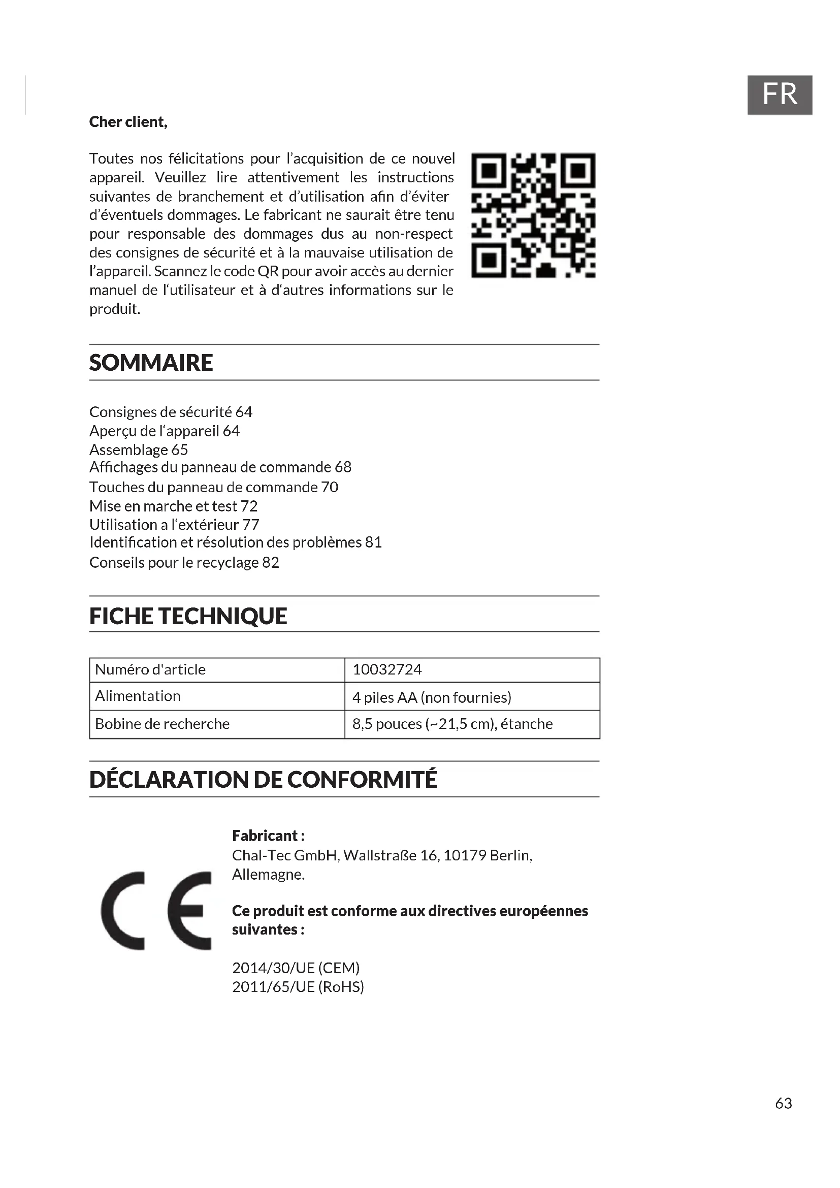 Fabricant : Chal-Tec GmbH, Wallstraße 16, 10179 Berlin, Allemagne. Ce produit est conforme aux directives européennes suivantes : 2014/30/UE (CEM) 2011/65/UE (RoHS)64