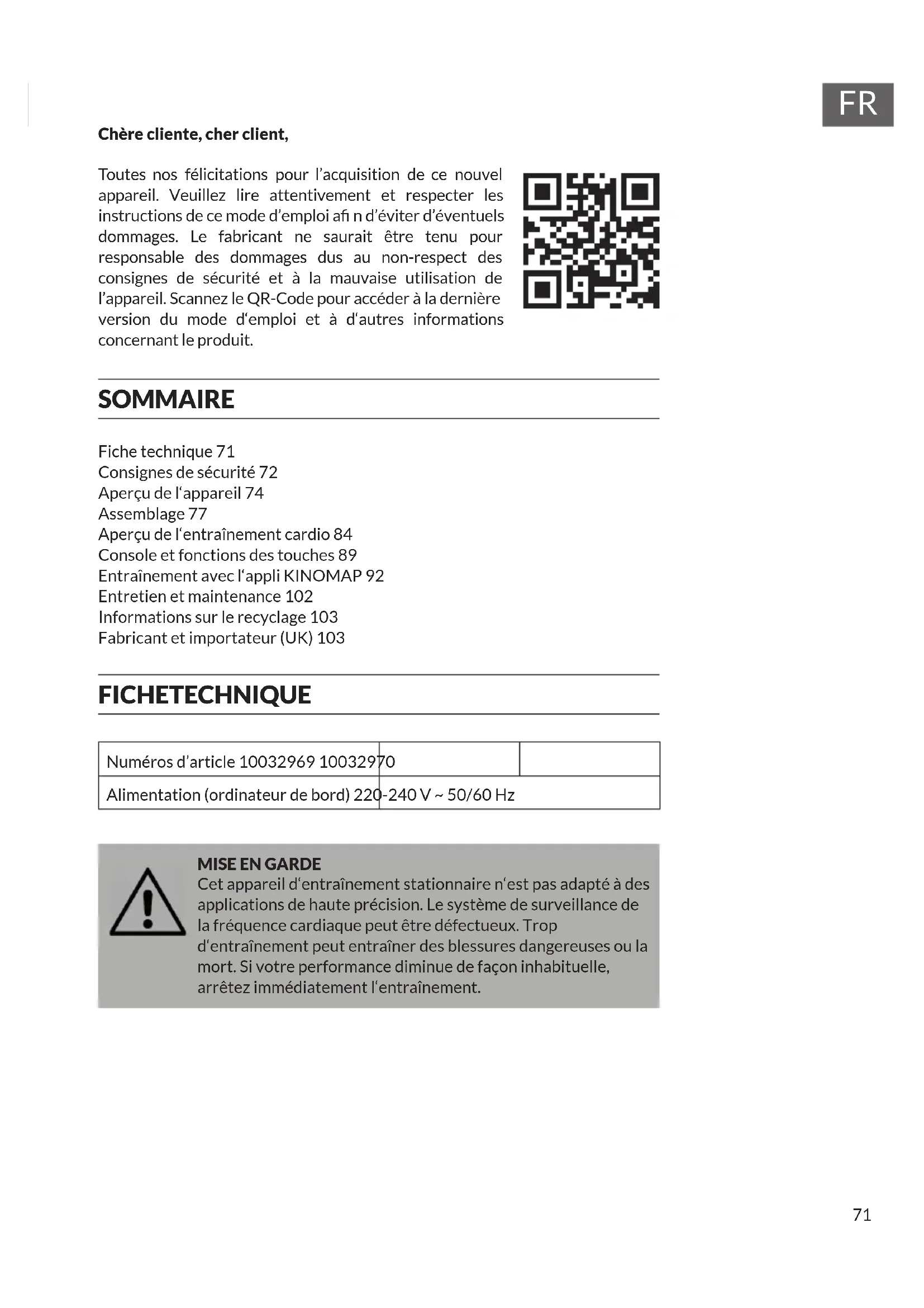 Cet appareil d‘entraînement stationnaire n‘est pas adapté à des applications de haute précision. Le système de surveillance de la fréquence cardiaque peut être défectueux. Trop d‘entraînement peut entraîner des blessures dangereuses ou la mort. Si votre performance diminue de façon inhabituelle, arrêtez immédiatement l‘entraînement. Fiche technique71 Consignes de sécurité72 Aperçu de l‘appareil74 Assemblage77 Aperçu de l‘entraînement cardio84 Console et fonctions des touches89 Entraînement avec l‘appli KINOMAP92 Entretien et maintenance102 Informations sur le recyclage103 Fabricant et importateur (UK)103 Chère cliente, cher client, Toutes nos félicitations pour l’acquisition de ce nouvel appareil. Veuillez lire attentivement et respecter les instructions de ce mode d’emploi a n d’éviter d’éventuels dommages. Le fabricant ne saurait être tenu pour responsable des dommages dus au non-respect des consignes de sécurité et à la mauvaise utilisation de l’appareil. Scannez le QR-Code pour accéder à la dernière version du mode d‘emploi et à d‘autres informations concernant le produit. SOMMAIRE72