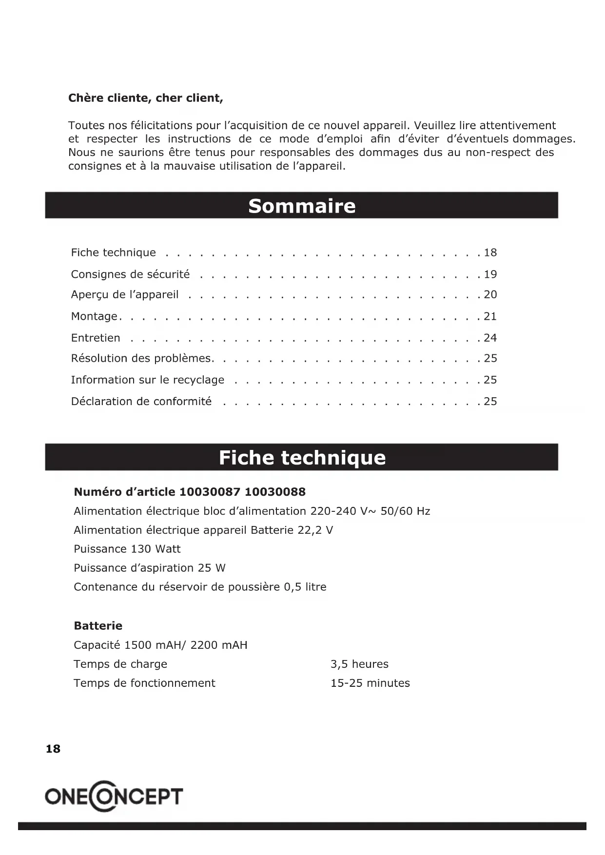 - Déclaration de conformité Numéro d’article 10030087 10030088 Alimentation électrique bloc d’alimentation 220-240 V~ 50/60 Hz Alimentation électrique appareil Batterie 22,2 V Puissance 130 Watt Puissance d’aspiration 25 W Contenance du réservoir de poussière 0,5 litre Batterie Capacité 1500 mAH/ 2200 mAH Temps de charge 3,5 heures Temps de fonctionnement 15-25 minutes19 Consignes de sécurité p. 25