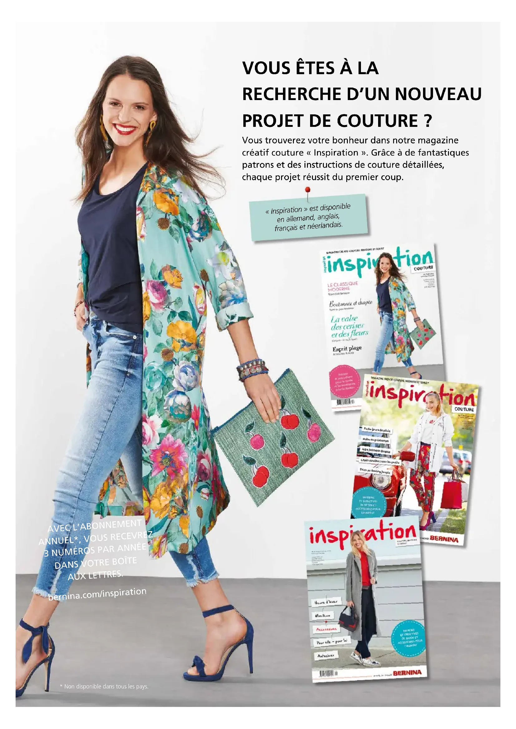 inspiration – le magazine dédié à la couture Vous êtes en quête d'idées, recherchez des patrons de couture et des instructions pour des projets épatants? Le magazine BERNINA «inspiration» est exactement ce dont vous avez besoin. De parution trimestrielle, «inspiration» fournit d'épatantes idées de couture et de broderies. Il traite des tendances de saison en matière de mode et des accessoires de mode, donne des conseils pratiques ainsi que des idées originales pour la décoration de votre intérieur. http://www.bernina.com/inspiration Le magazine est disponible en anglais, allemand, néerlandais et français. Il n'est pas disponible dans tous les pays. Blog BERNINA Instructions astucieuses, patrons de couture et modèles de broderie gratuits ainsi que nombreuses nouvelles idées: vous retrouverez tout ceci chaque semaine sur le blog inédit de BERNINA. Nos expert(e)s vous donnent de précieux conseils et expliquent, étape par étape, comment atteindre le résultat souhaité. Vous pouvez charger vos propres projets dans la communauté et échanger ainsi avec d'autres passionnés de couture et de broderie. http://www.bernina.com/blog Disponible en anglais, en allemand et en néerlandais. BERNINA Social Media Suivez-nous sur les réseaux sociaux et découvrez nos événements, des projets passionnants ainsi que des conseils et astuces liés à la couture et à la broderie. Nous vous tenons informés des actualités et nous nous réjouissons de pouvoir vous montrer l'un ou l'autre aspect remarquable de l'univers BERNINA. http://www.bernina.com/social-media