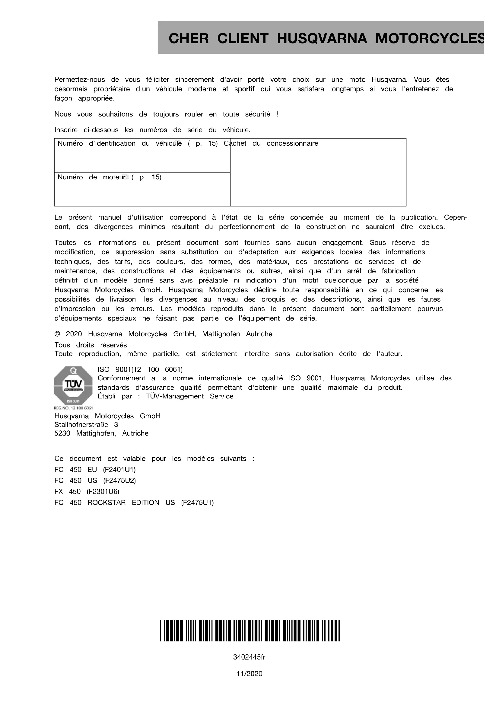Permettez-nous de vous féliciter sincèrement d'avoir porté votre choix sur une moto Husqvarna. Vous êtes désormais propriétaire d'un véhicule moderne et sportif qui vous satisfera longtemps si vous l'entretenez de façon appropriée. Nous vous souhaitons de toujours rouler en toute sécurité ! Inscrire ci-dessous les numéros de série du véhicule. Numéro d’identification du véhicule ( p. 15) Cachet du concessionnaire Numéro de moteur ( p. 15) Le présent manuel d'utilisation correspond à l'état de la série concernée au moment de la publication. Cepen- dant, des divergences minimes résultant du perfectionnement de la construction ne sauraient être exclues. Toutes les informations du présent document sont fournies sans aucun engagement. Sous réserve de modification, de suppression sans substitution ou d'adaptation aux exigences locales des informations techniques, des tarifs, des couleurs, des formes, des matériaux, des prestations de services et de maintenance, des constructions et des équipements ou autres, ainsi que d'un arrêt de fabrication définitif d'un modèle donné sans avis préalable ni indication d'un motif quelconque par la société Husqvarna Motorcycles GmbH. Husqvarna Motorcycles décline toute responsabilité en ce qui concerne les possibilités de livraison, les divergences au niveau des croquis et des descriptions, ainsi que les fautes d'impression ou les erreurs. Les modèles reproduits dans le présent document sont partiellement pourvus d'équipements spéciaux ne faisant pas partie de l'équipement de série. © 2020 Husqvarna Motorcycles GmbH, Mattighofen Autriche Tous droits réservés Toute reproduction, même partielle, est strictement interdite sans autorisation écrite de l'auteur. ISO 9001(12 100 6061) Conformément à la norme internationale de qualité ISO 9001, Husqvarna Motorcycles utilise des standards d'assurance qualité permettant d'obtenir une qualité maximale du produit. Établi par : TÜV-Management Service Husqvarna Motorcycles GmbH Stallhofnerstraße 3 5230 Mattighofen, Autriche Ce document est valable pour les modèles suivants : FC 450 EU (F2401U1) FC 450 US (F2475U2) FX 450 (F2301U6) FC 450 ROCKSTAR EDITION US (F2475U1)SOMMAIRE