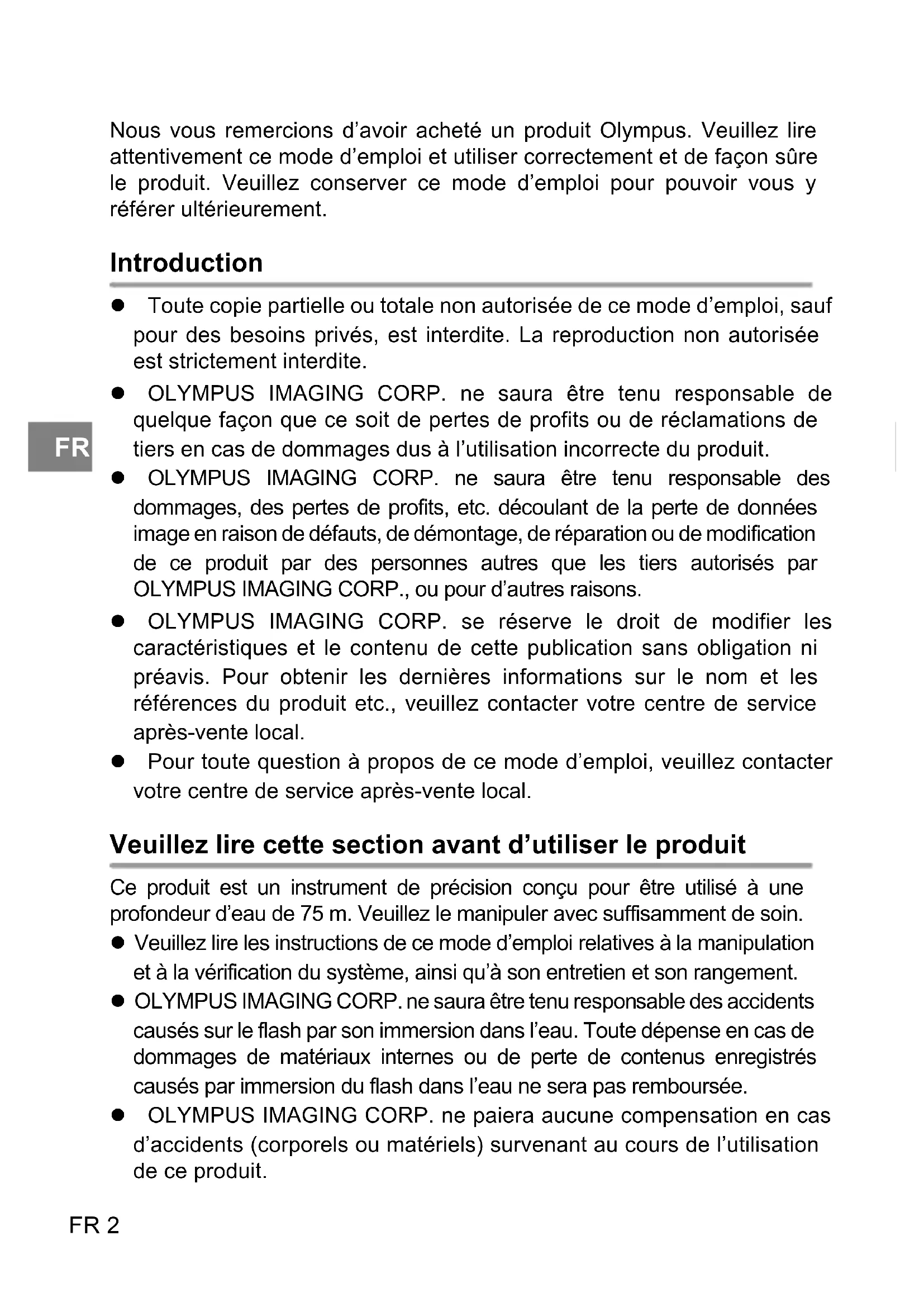 Nous vous remercions d’avoir acheté un produit Olympus. Veuillez lire attentivement ce mode d’emploi et utiliser correctement et de façon sûre le produit. Veuillez conserver ce mode d’emploi pour pouvoir vous y référer ultérieurement. Introduction z Toute copie partielle ou totale non autorisée de ce mode d’emploi, sauf pour des besoins privés, est interdite. La reproduction non autorisée est strictement interdite. z OLYMPUS IMAGING CORP. ne saura être tenu responsable de quelque façon que ce soit de pertes de profits ou de réclamations de tiers en cas de dommages dus à l’utilisation incorrecte du produit. z OLYMPUS IMAGING CORP. ne saura être tenu responsable des dommages, des pertes de profits, etc. découlant de la perte de données image en raison de défauts, de démontage, de réparation ou de modification de ce produit par des personnes autres que les tiers autorisés par OLYMPUS IMAGING CORP., ou pour d’autres raisons. z OLYMPUS IMAGING CORP. se réserve le droit de modifier les caractéristiques et le contenu de cette publication sans obligation ni préavis. Pour obtenir les dernières informations sur le nom et les références du produit etc., veuillez contacter votre centre de service après-vente local. z Pour toute question à propos de ce mode d’emploi, veuillez contacter votre centre de service après-vente local. Veuillez lire cette section avant d’utiliser le produit Ce produit est un instrument de précision conçu pour être utilisé à une profondeur d’eau de 75 m. Veuillez le manipuler avec suffisamment de soin. z Veuillez lire les instructions de ce mode d’emploi relatives à la manipulation et à la vérification du système, ainsi qu’à son entretien et son rangement. z OLYMPUS IMAGING CORP. ne saura être tenu responsable des accidents causés sur le flash par son immersion dans l’eau. Toute dépense en cas de dommages de matériaux internes ou de perte de contenus enregistrés causés par immersion du flash dans l’eau ne sera pas remboursée. z OLYMPUS IMAGING CORP. ne paiera aucune compensation en cas d’accidents (corporels ou matériels) survenant au cours de l’utilisation de ce produit. UFL-3_FR.book Page 2 Thursday, July 17, 2014 5:21 PMFR 3