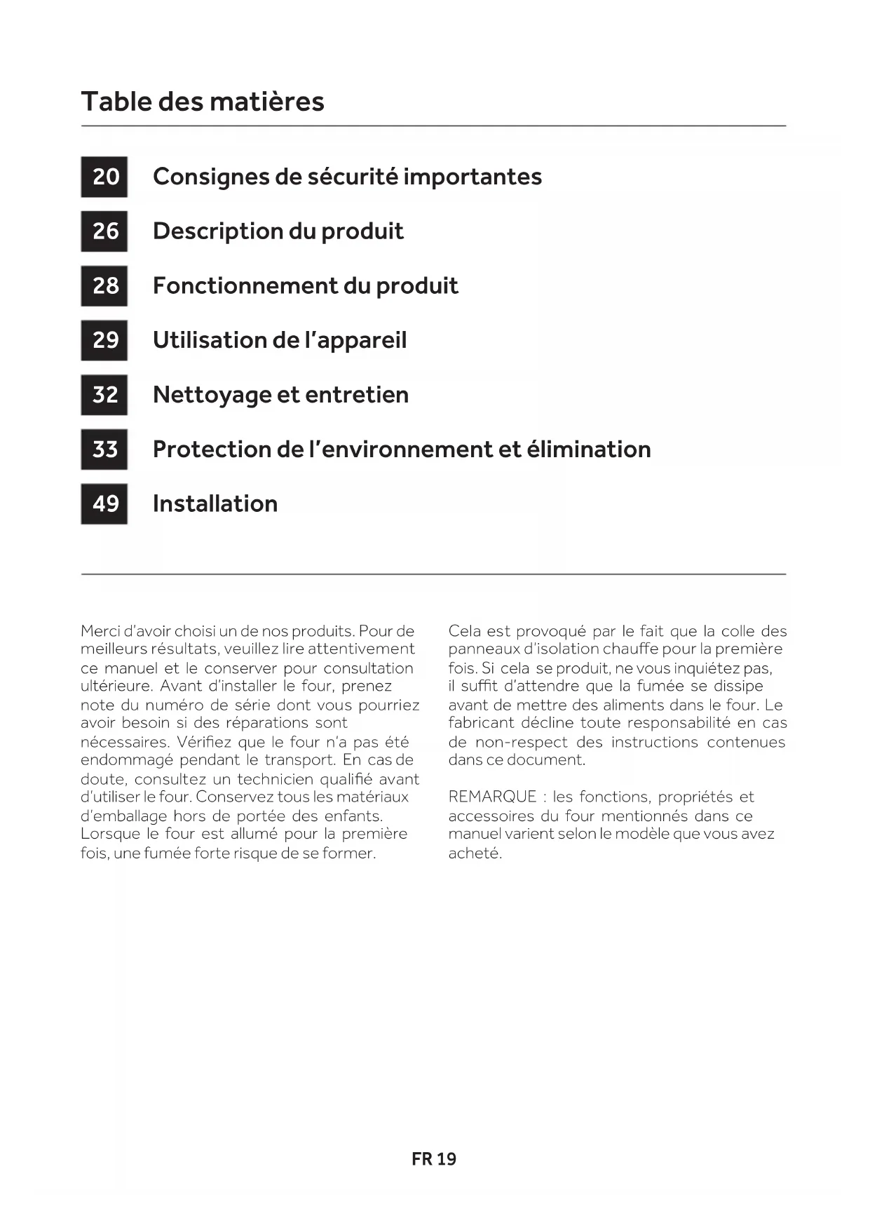 pean safety, health and environmental require- ments which are applicable in legislation for this product. Environmental protection and disposalFR 19 Merci d’avoir choisi un de nos produits. Pour de meilleurs résultats, veuillez lire attentivement ce manuel et le conserver pour consultation ultérieure. Avant d’installer le four, prenez note du numéro de série dont vous pourriez avoir besoin si des réparations sont nécessaires. Vériez que le four n’a pas été endommagé pendant le transport. En cas de doute, consultez un technicien qualié avant d’utiliser le four. Conservez tous les matériaux d’emballage hors de portée des enfants. Lorsque le four est allumé pour la première fois, une fumée forte risque de se former. Cela est provoqué par le fait que la colle des panneaux d’isolation chaue pour la première fois. Si cela se produit, ne vous inquiétez pas, il sut d’attendre que la fumée se dissipe avant de mettre des aliments dans le four. Le fabricant décline toute responsabilité en cas de non-respect des instructions contenues dans ce document. REMARQUE : les fonctions, propriétés et accessoires du four mentionnés dans ce manuel varient selon le modèle que vous avez acheté. Consignes de sécurité importantes Description du produit Fonctionnement du produit Utilisation de l’appareil Nettoyage et entretien Protection de l’environnement et élimination Installation